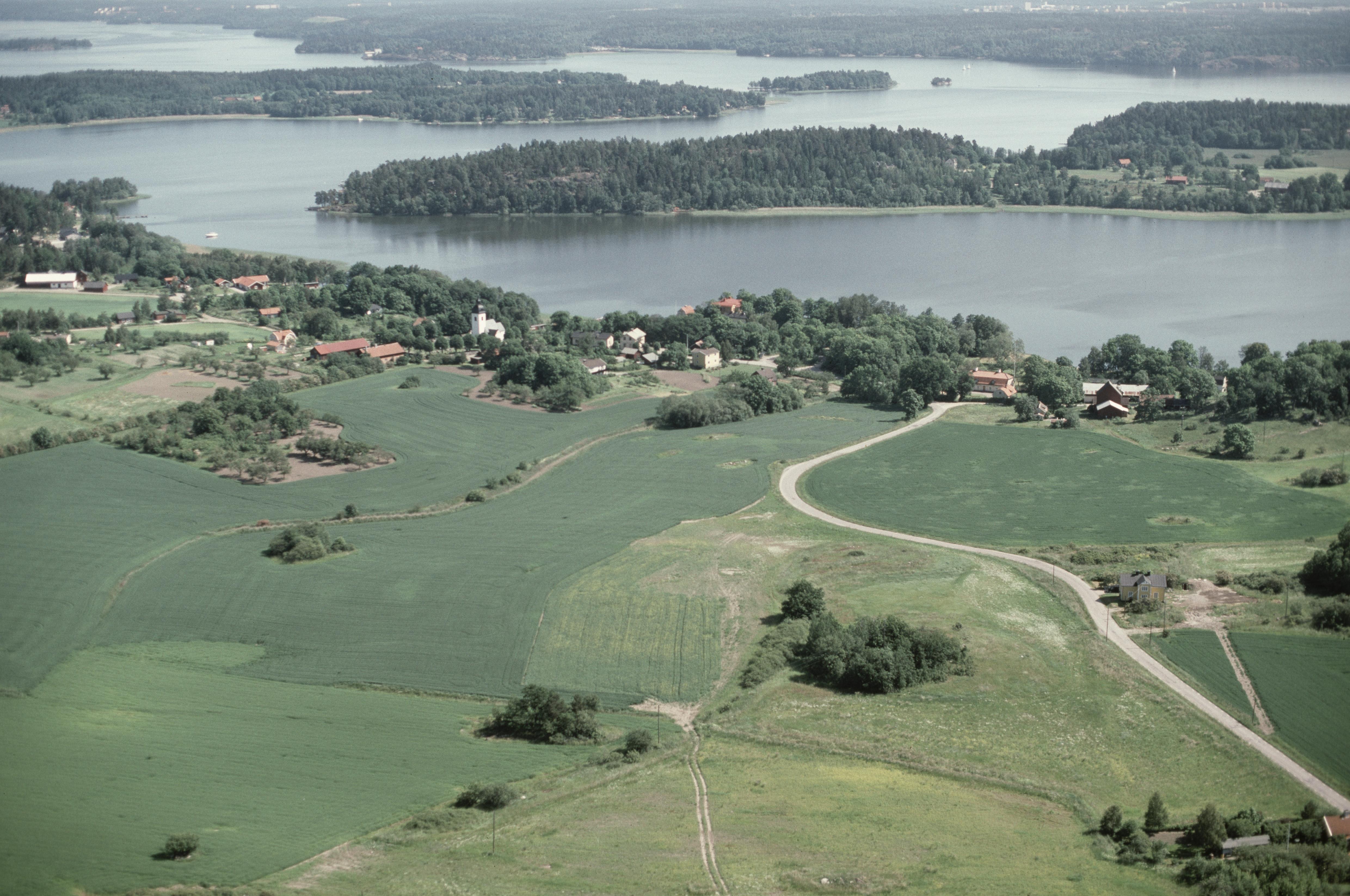 Beskrivning: Färingsö i Mälaren. Vid bildens mitt Hilleshögs kyrka och kyrkby. Bytomt RAÄnr Hilleshög 80:1, runristningar Hilleshög RAÄnr 38:1-5 m.fl. Bilden är tagen mot (väderstreck): NO
