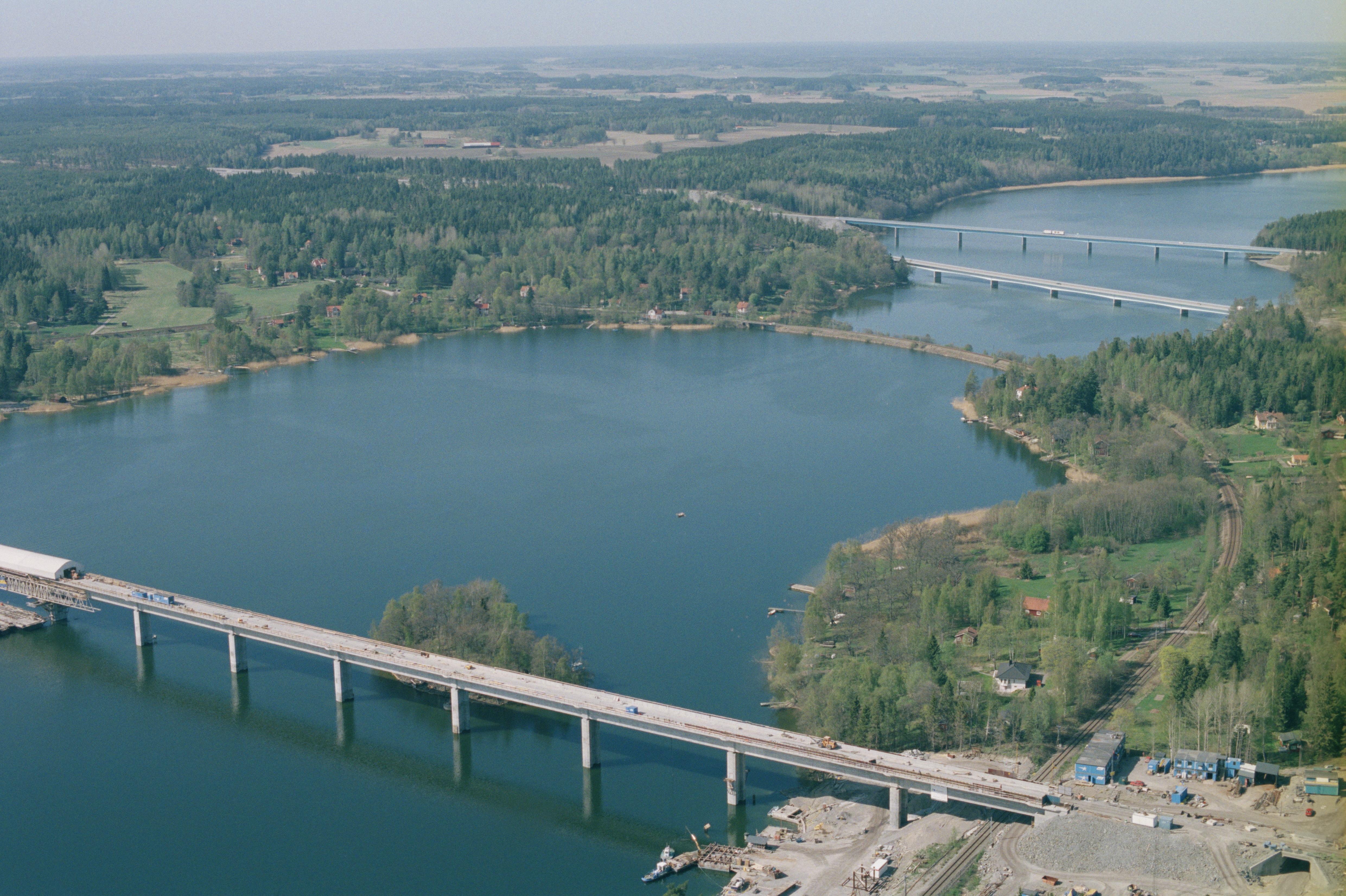 Beskrivning: Beskrivning: Broar över Ekolsundsviken. I bildens nedre del bygge av järnvägsbro vid Myrholmen. Uppe till vänster området Ekolsund i socknet Husby-Sjultoft. I bildens högre del Stämsvik i socknet Övergran. Bilden är tagen mot (väderstreck): NV Fotosyfte: Flygbildsdokumentation