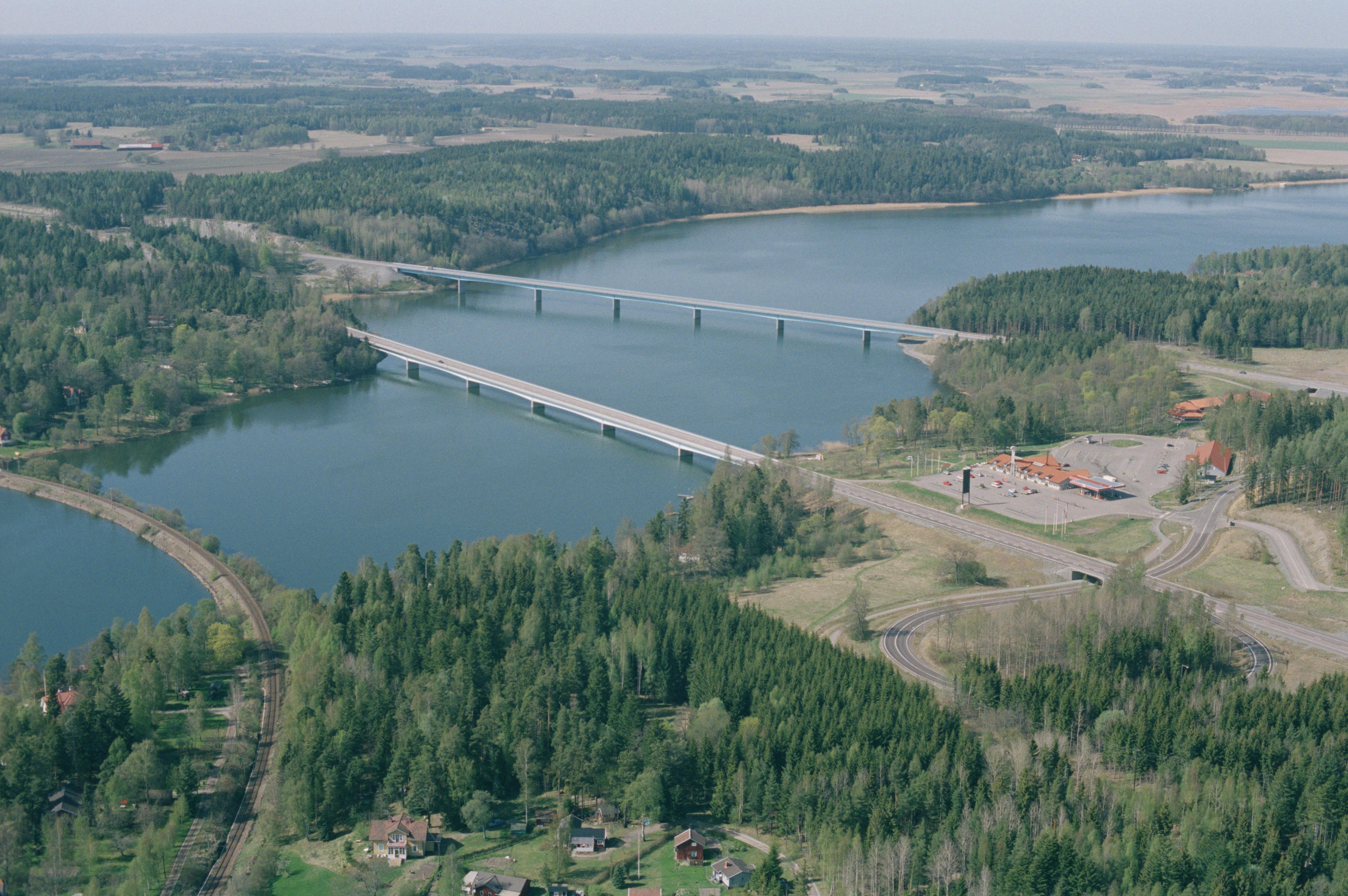 Beskrivning: Broar över Ekolsundsviken. Uppe till vänster området Ekolsund i socknet Husby-Sjultoft. I bildens nedre och högre del Stämsvik i socknet Övergran. Bilden är tagen mot (väderstreck): NV