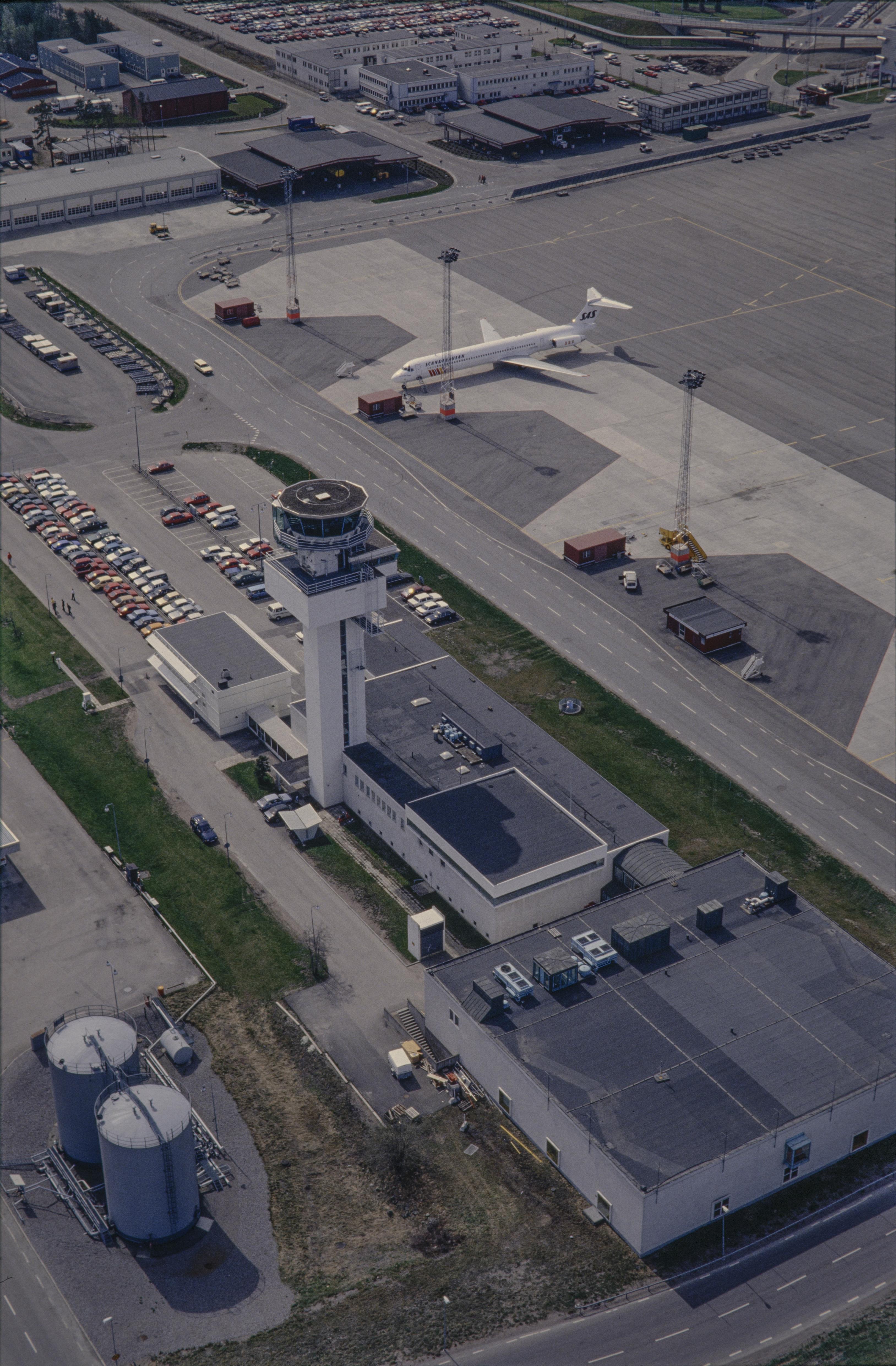 Beskrivning: Stockholms flygplats / Stockholm Arlanda Airport. Flygledartornet vid bildens mitt (tornet revs c:a 2006). Bilden är tagen mot (väderstreck): SSV