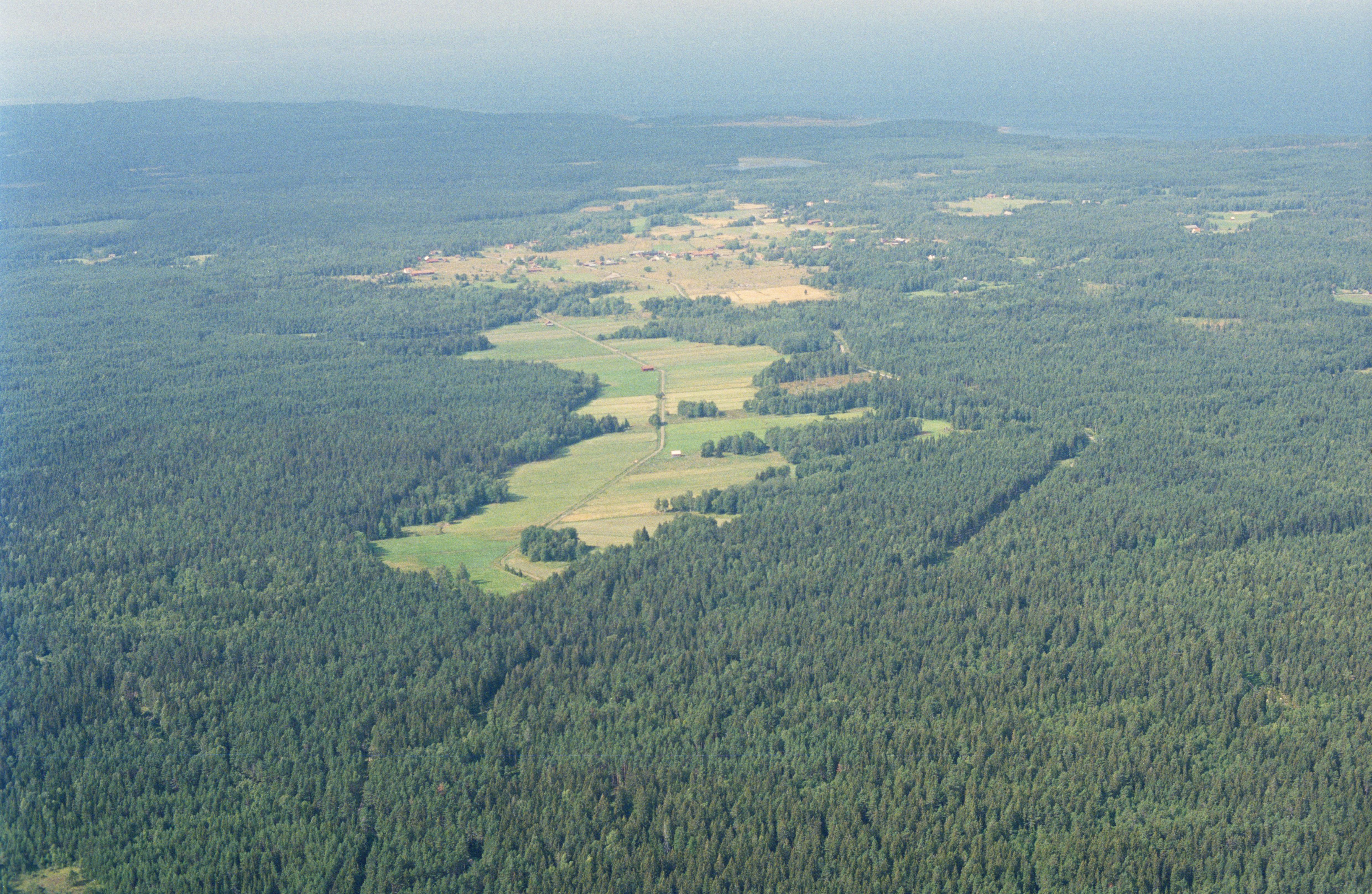 Beskrivning: Österrönningens dalgång. Över bildens mitt Hållens by i bytomt RAÄnr Hållnäs 280. Till höger i bildens övre del Björns skärgårds naturreservat. Bilden är tagen mot (väderstreck): NV