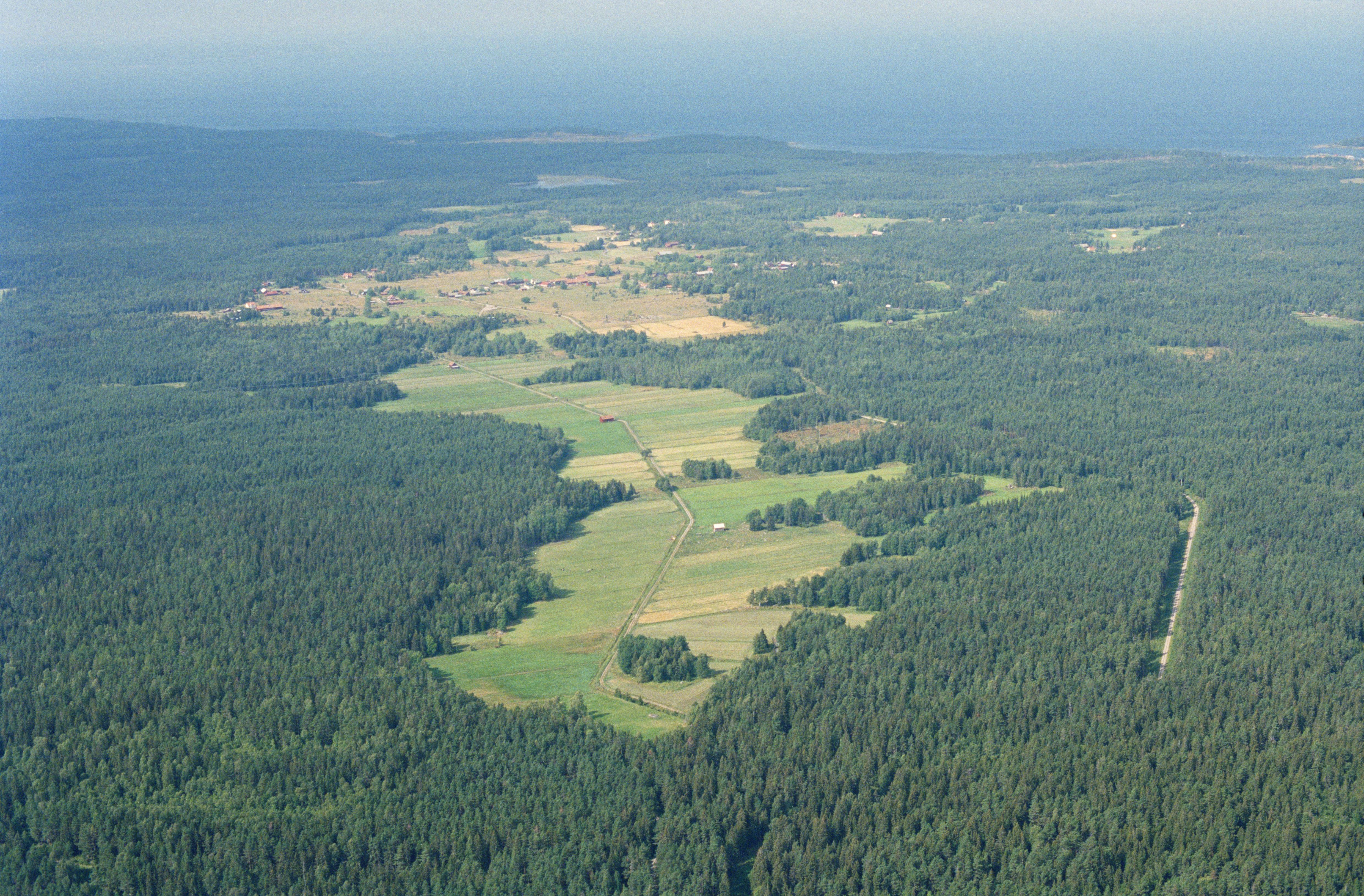 Beskrivning: Österrönningens dalgång. Över bildens mitt Hållens by i bytomt RAÄnr Hållnäs 280. Till höger i bildens övre del Björns skärgårds naturreservat. Bilden är tagen mot (väderstreck): NV