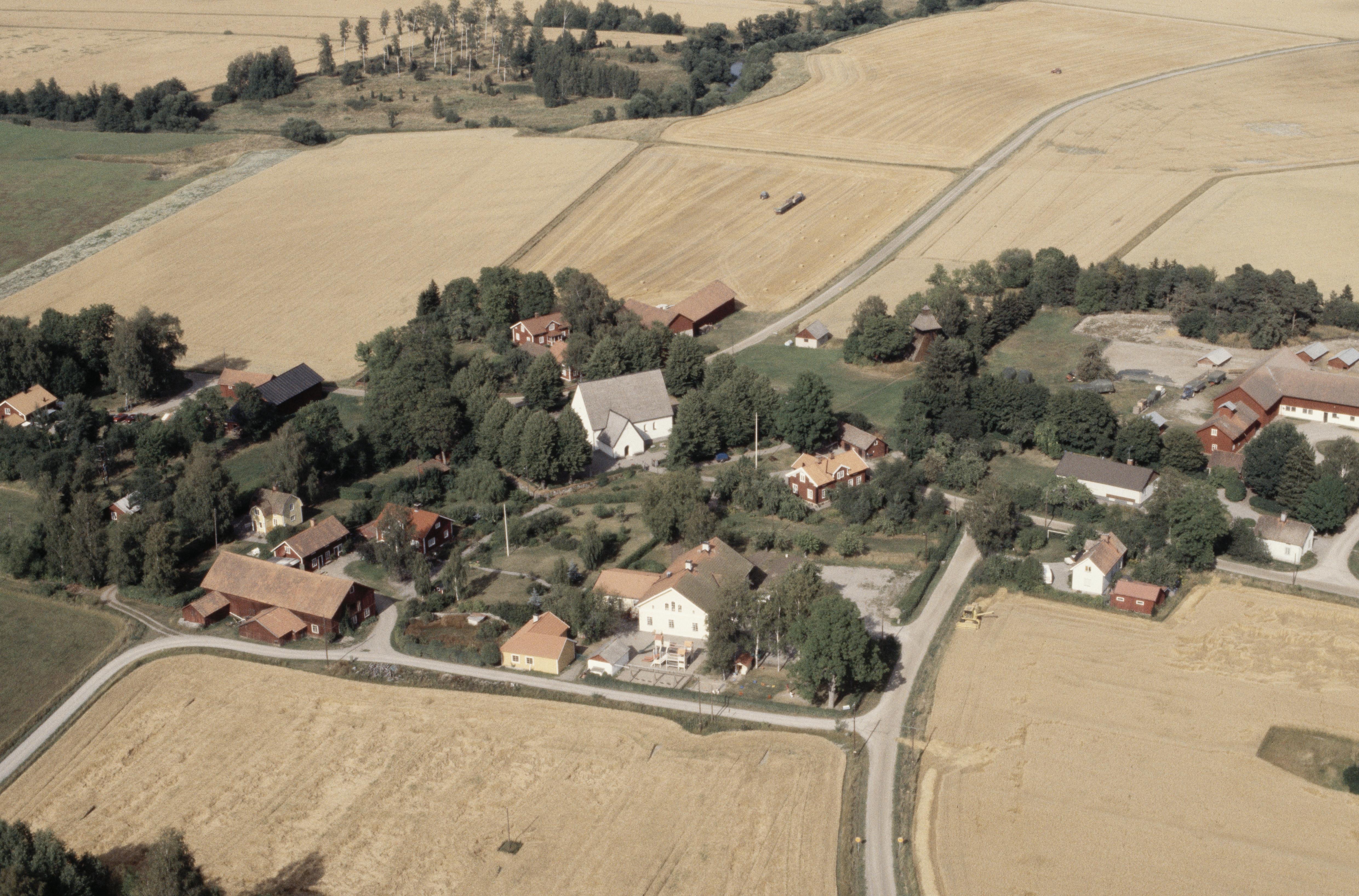 Beskrivning: Härnevi kyrka och kyrkby. I bildens övre del Örsundaån som markerar gränsen mot Torstuna socken. Bilden är tagen mot (väderstreck): NNO
