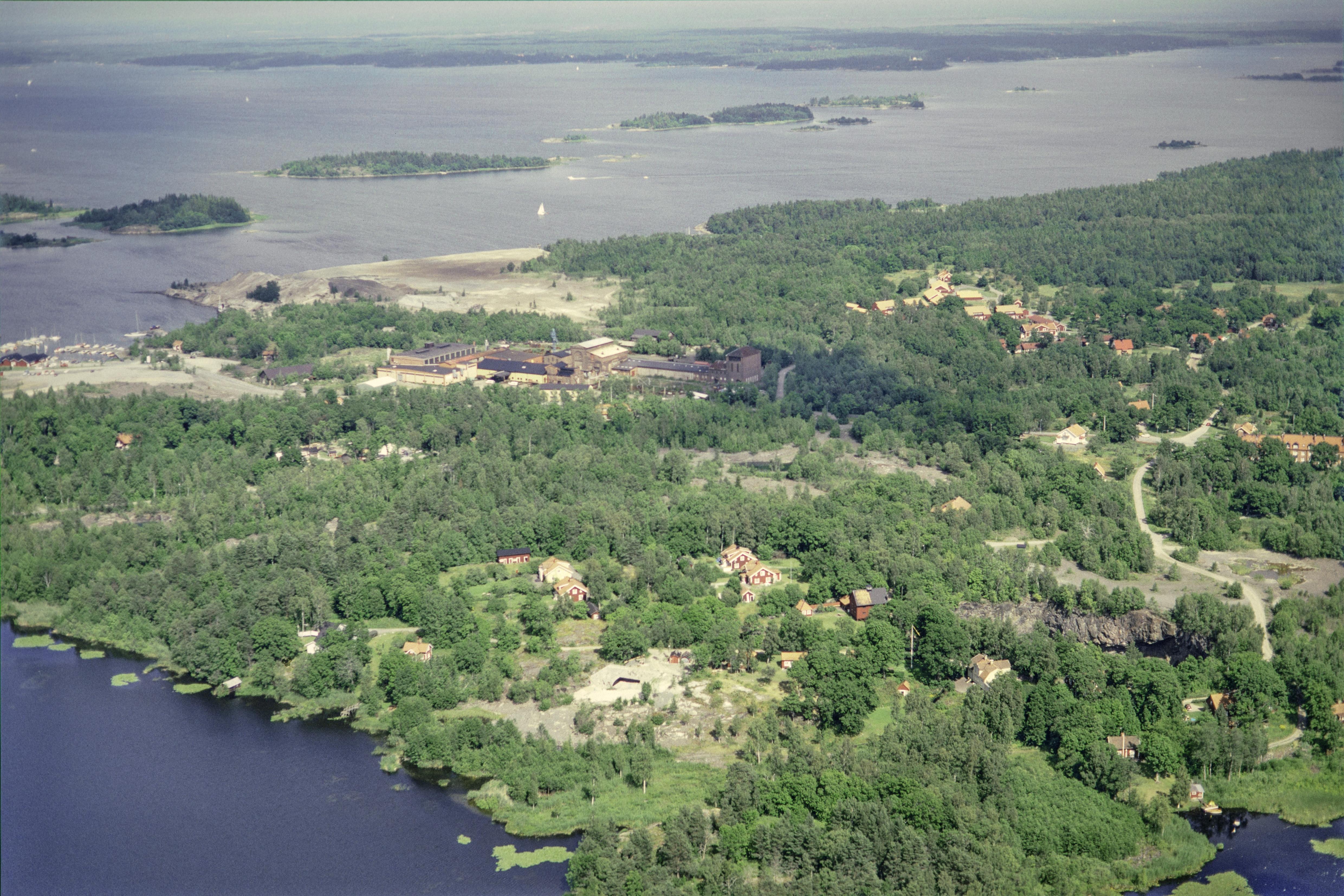 Beskrivning: Herrängs bruk, tätort och gruvområde vid Singöfjärden. Vid bildens mitt gjuteri RAÄnr Häverö 355:1, gruvhål Häverö 410:1 m.fl. Nere till vänster sjön Blåkaren. I bildens övre del Singö socken. Bilden är tagen mot (väderstreck): NO