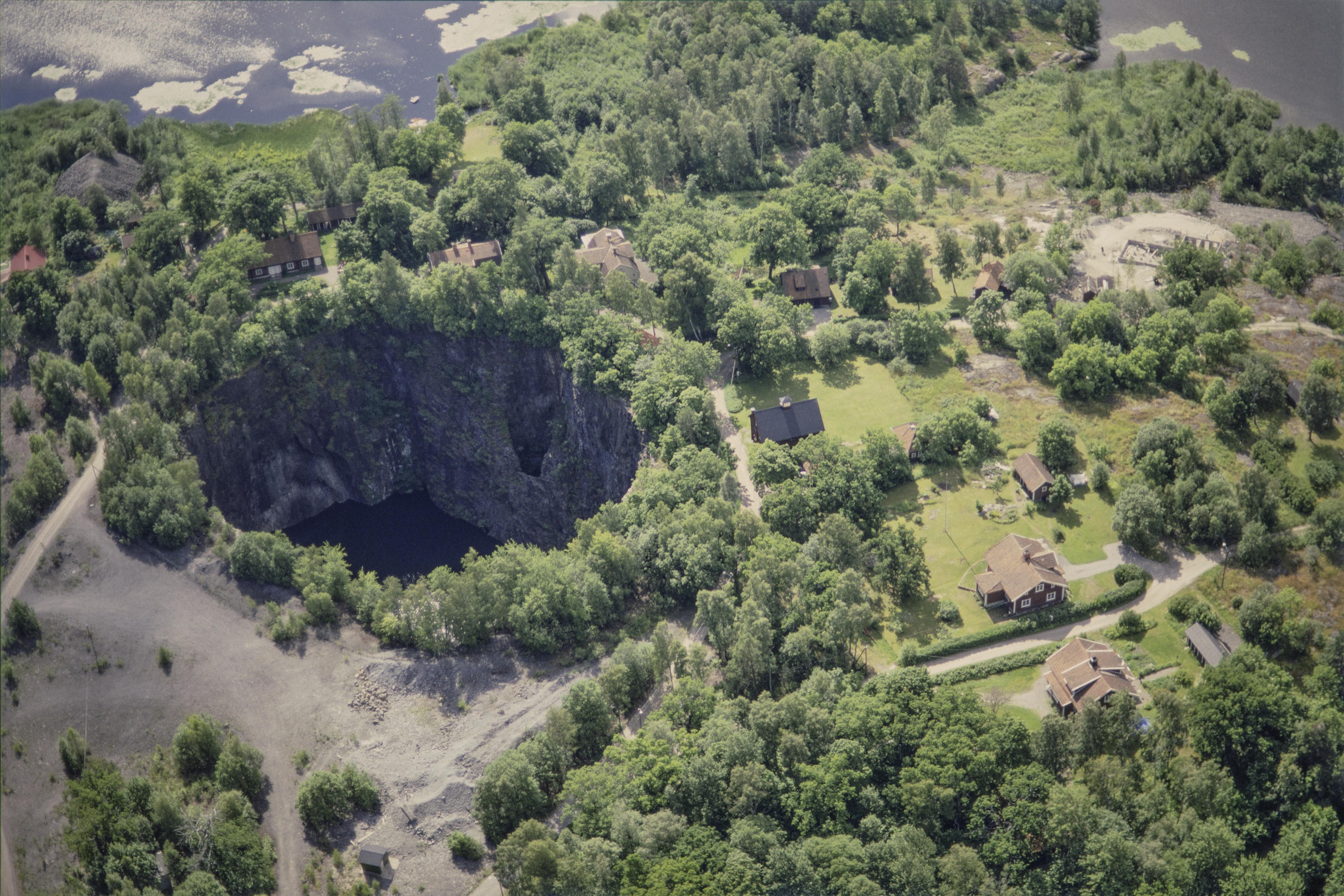 Beskrivning: Herrängs bruk, tätort och gruvområde vid Singöfjärden. Eknäsgruvan RAÄnr Häverö 356:1. Uppe i vänstra hörnet sjön Blåkaren. Bilden är tagen mot (väderstreck): SV