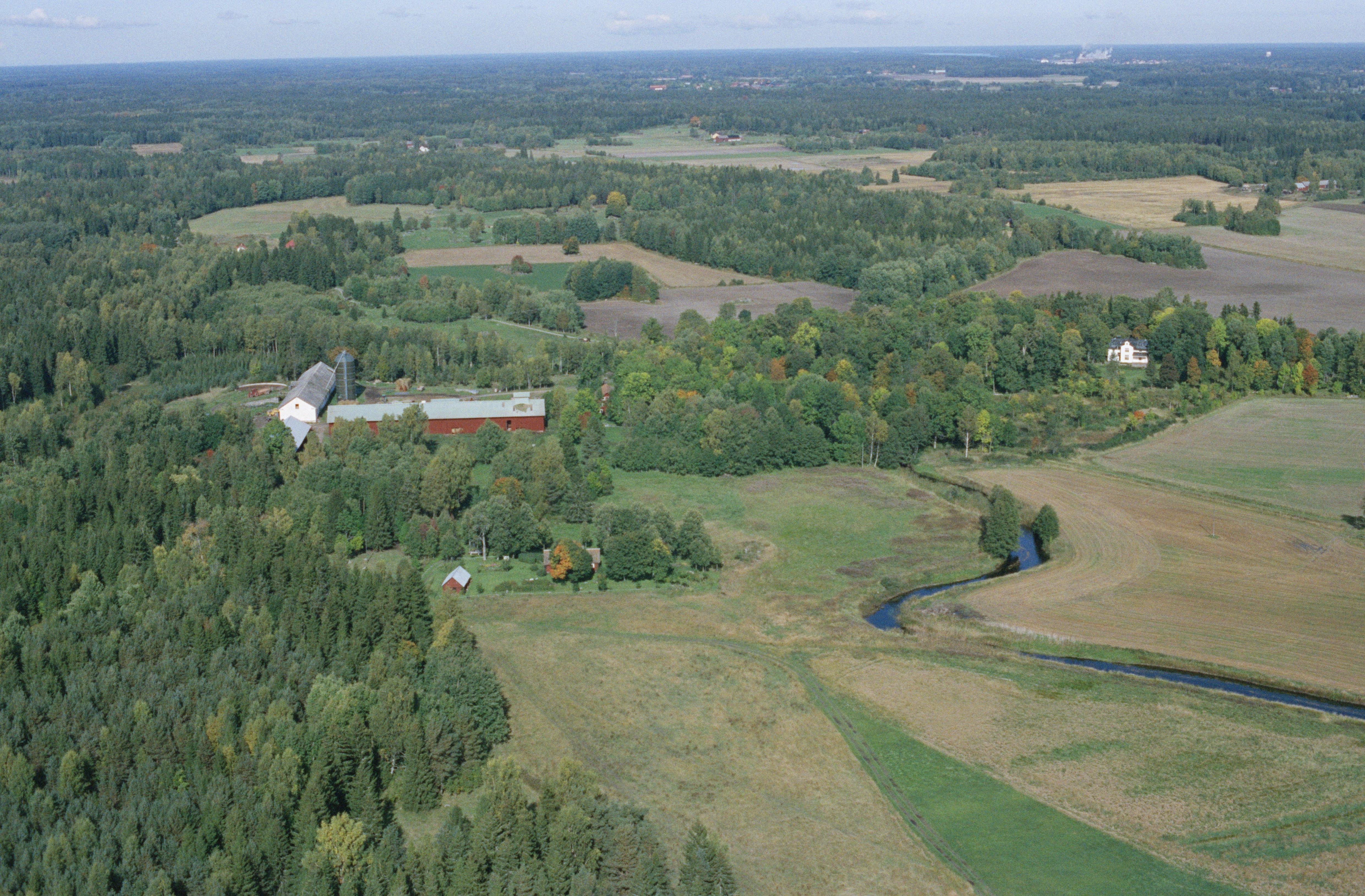 Beskrivning: Harbroholmsån vid Mjölnargården och Harbroholm, väster om Skebobruk. Uppe i högra hörnet Häverö socken. Bilden är tagen mot (väderstreck): NNO