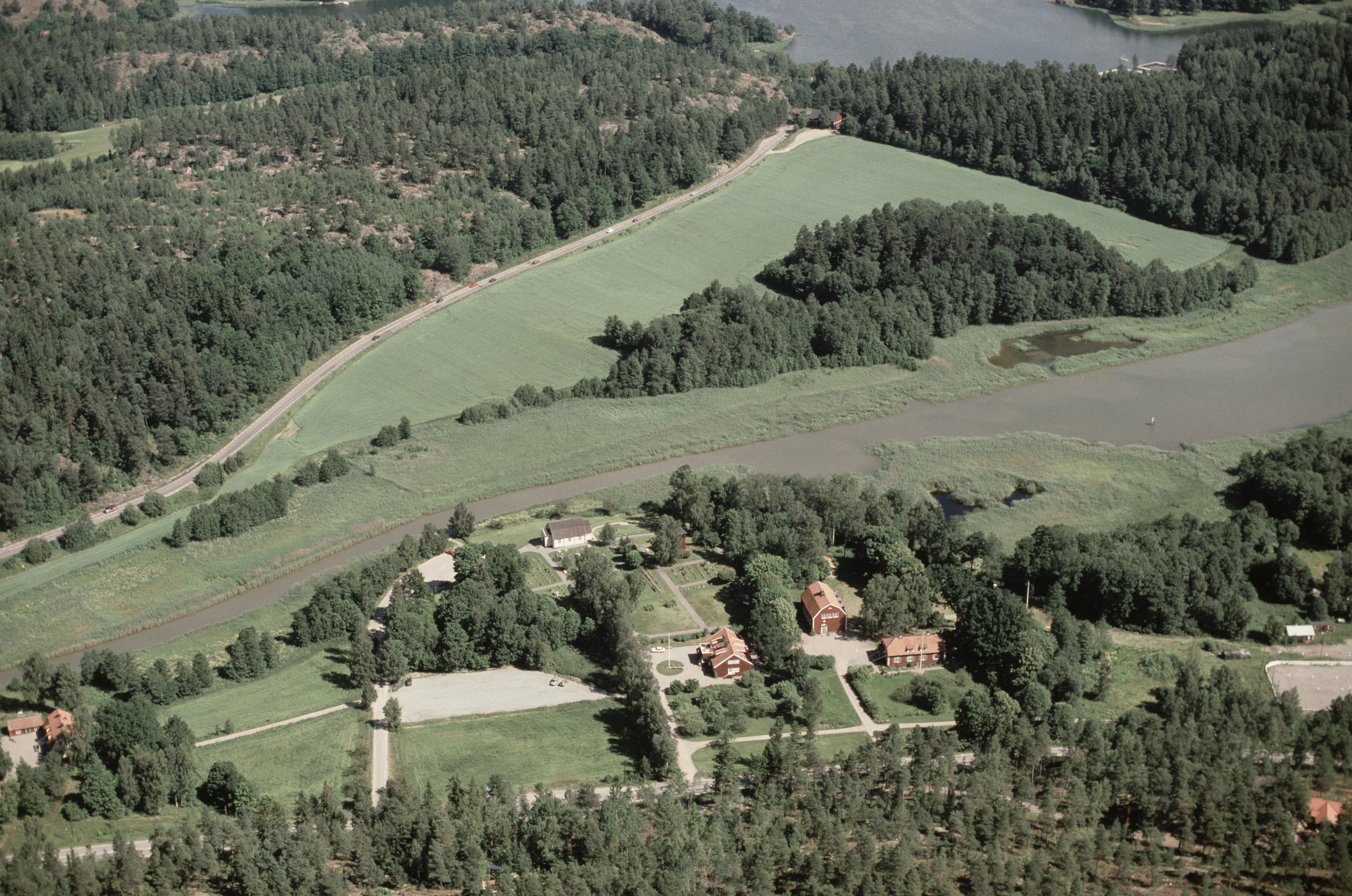 Beskrivning: Ingarö kyrka och Ingarö gamla skola vid sundet Kolström. Bilden är tagen mot (väderstreck): NNO
