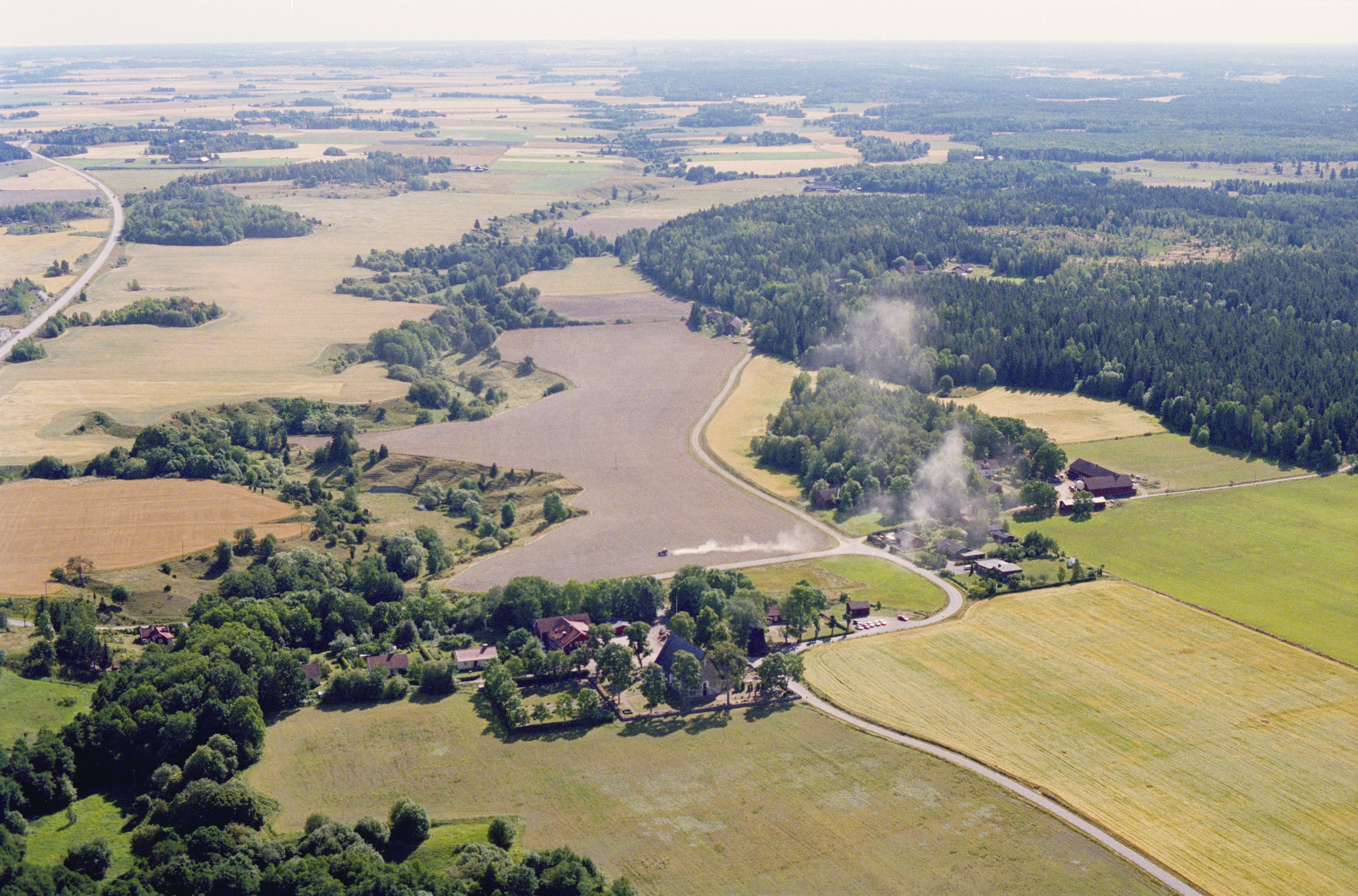 Beskrivning: Jumkils kyrka vid Jumkilsån. I bildens övre del socknen Åkerby och Börje. Bilden är tagen mot (väderstreck): SO