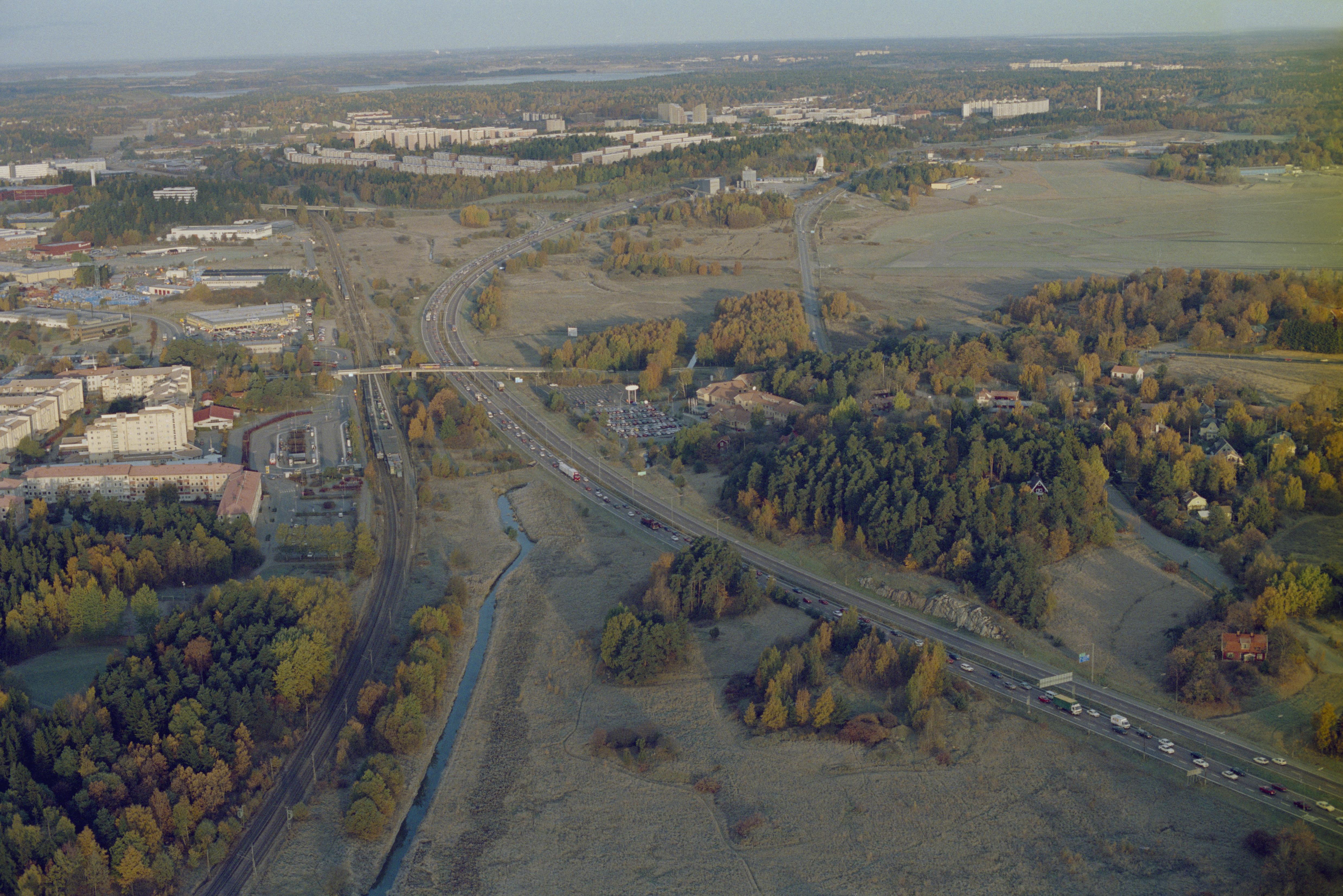 Beskrivning: Bällstaån vid norra Hjulsta. I bildens mitt Barkarby och sockengränsen mellan Järfälla (bildens övre del) och Stockholm. Hjulsta gamla tomt RAÄnr Stockholm 615 nere till höger. I bildens övre del Jakobsberg. Bilden är tagen mot (väderstreck): NV