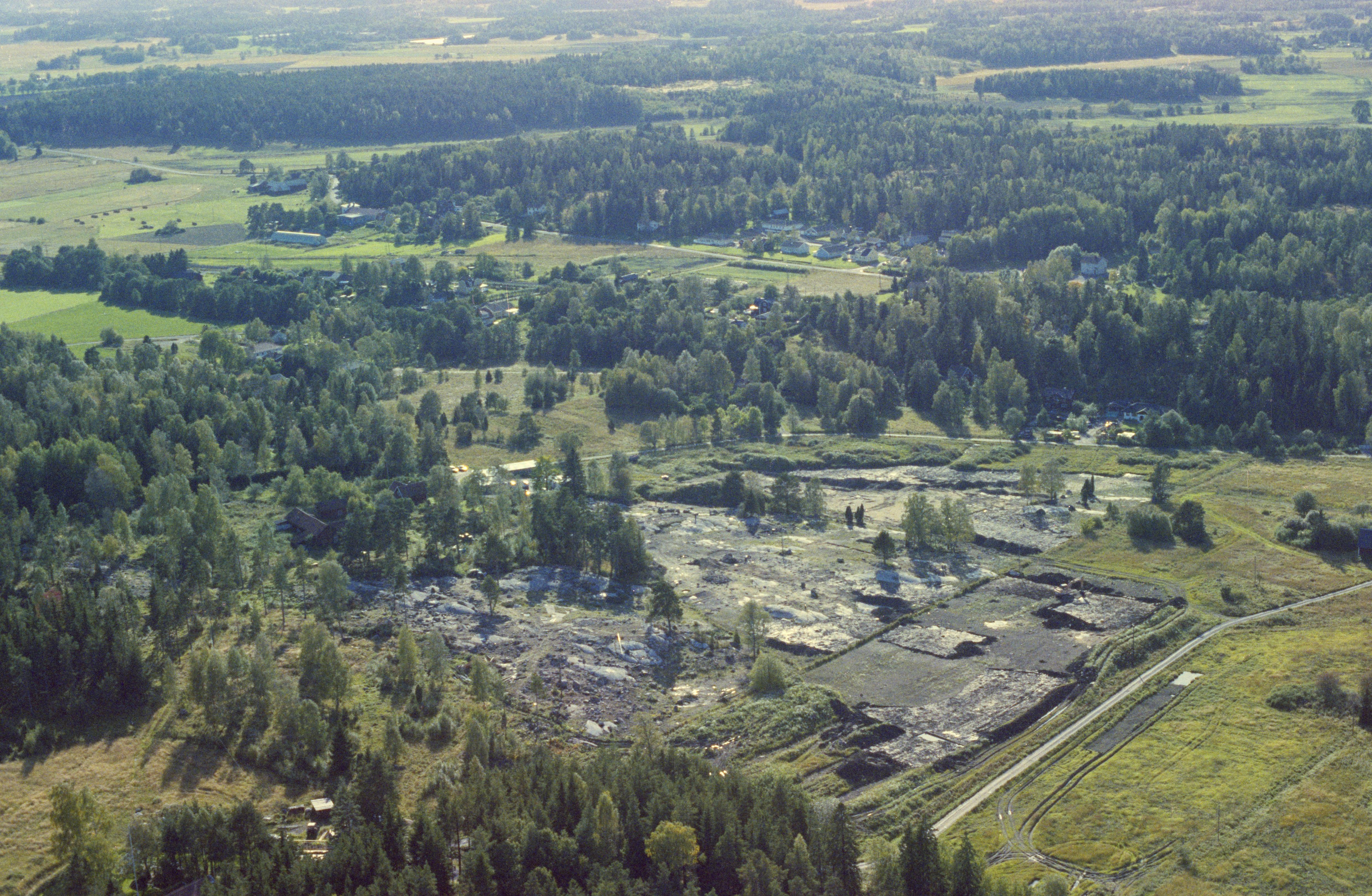 Beskrivning: Vid bildens mitt arkeologisk undersökning av Lustigkulla soldattorp och Adolfsberg norr om Vrå gård i området Alsike. Stensättningar, boplatser, gravfält, hällristningar, fossila åkrar RAÄnr Knivsta 16:1-6, 302, 306, 308, 311 m.fl. Till höger om bildens mitt Nyborg i Alsike socken. I bildens övre del Alsike socken mot Mälaren. Bilden är tagen mot (väderstreck): VSV