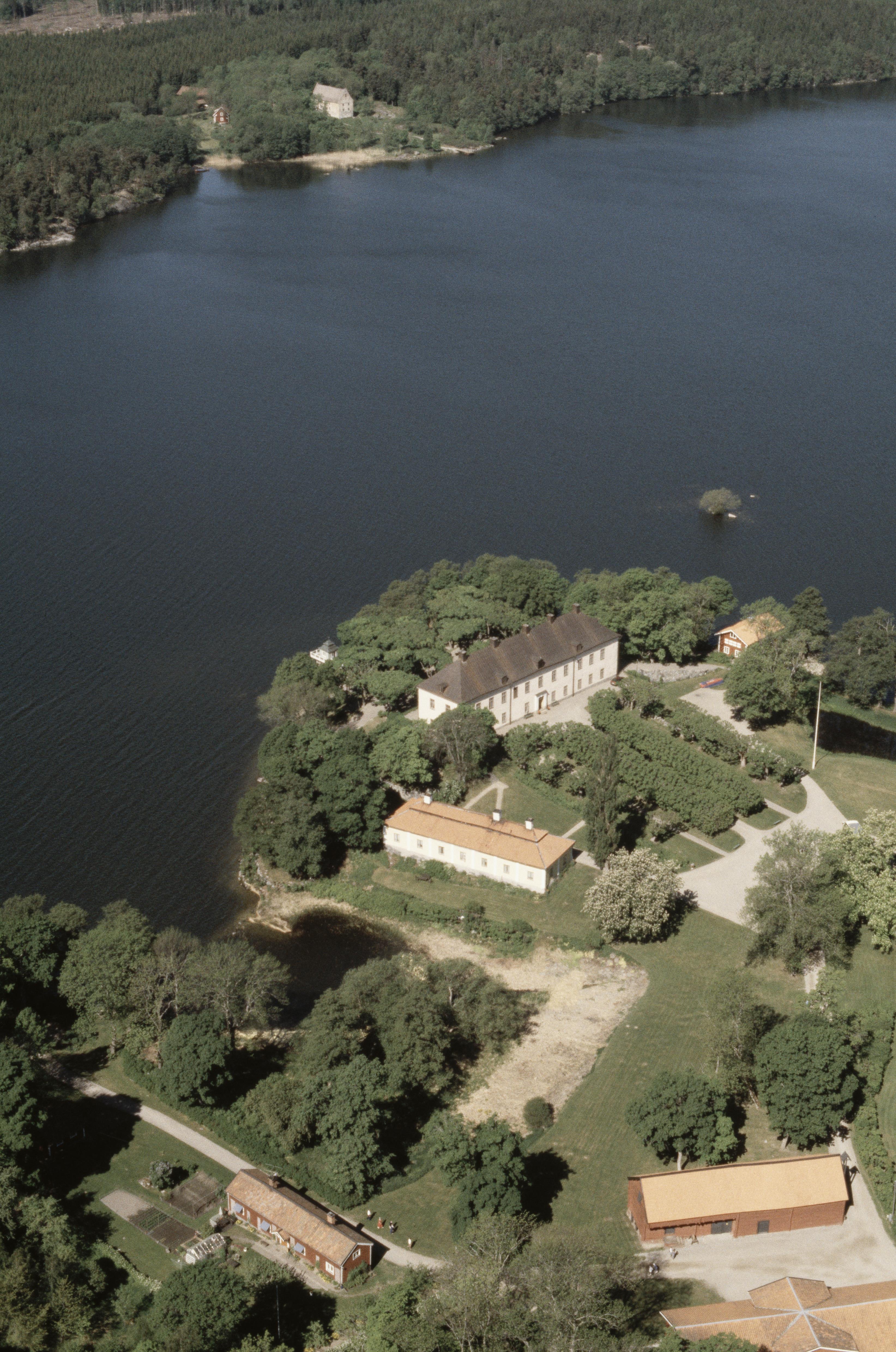 Beskrivning: Grönsö slott (äldre stavning Grönsöö slott), byggnadsminne RAÄnr Kungs-Husby 89:1, vid Grönsösundet i Mälaren. I bildens övre del statligt byggnadsminne Utö hus RAÄnr Kungs-Husby 70:1 på Arnö. Bilden är tagen mot (väderstreck): V
