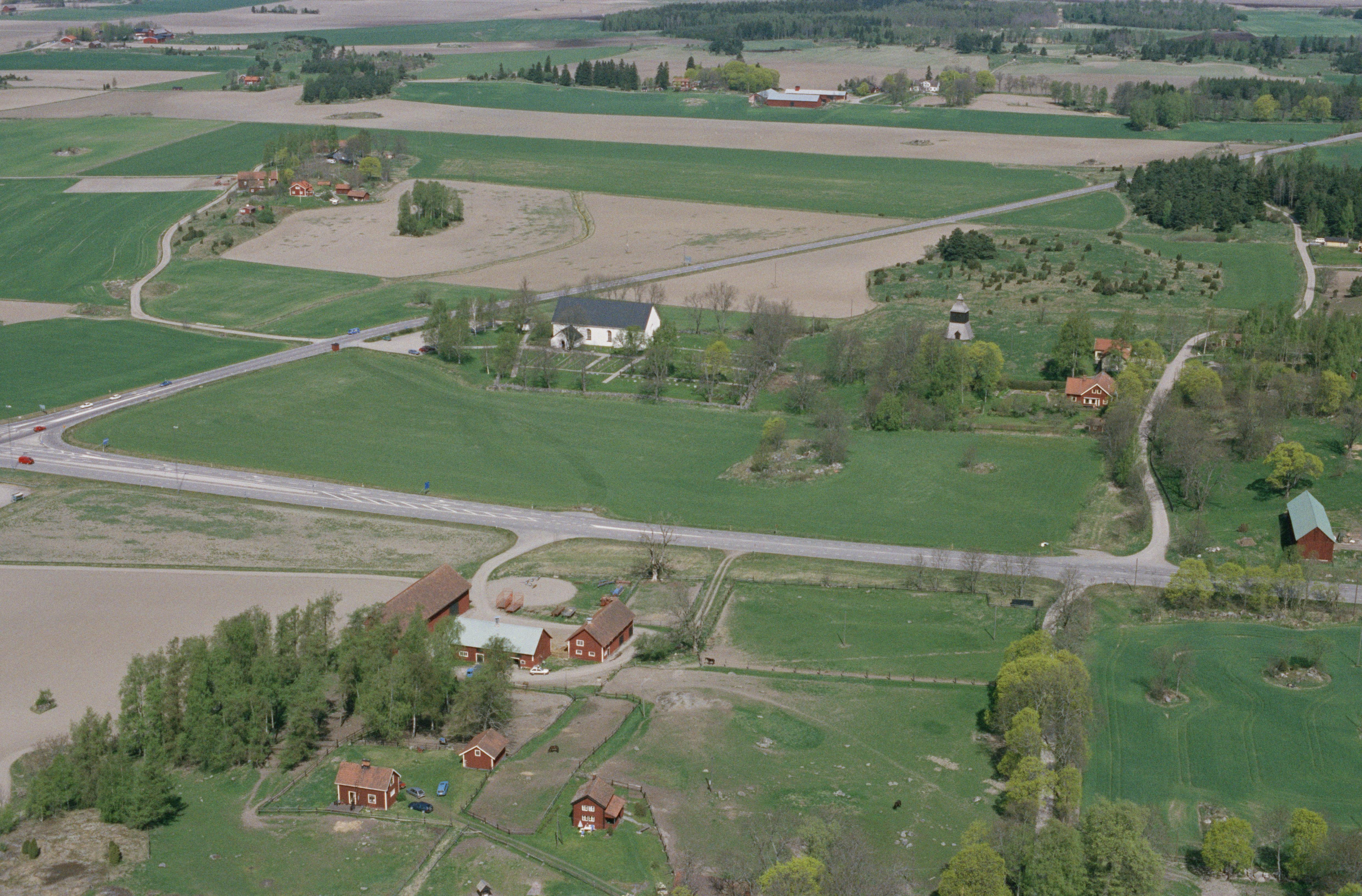 Beskrivning: Litslena kyrka och kyrkby. Uppe till vänster fornlämningsområdet Blomsterbacken med hällristningar och högar, bl.a. RAÄnr Litslena 149:1-2, 423:1-3. Bilden är tagen mot (väderstreck): NV