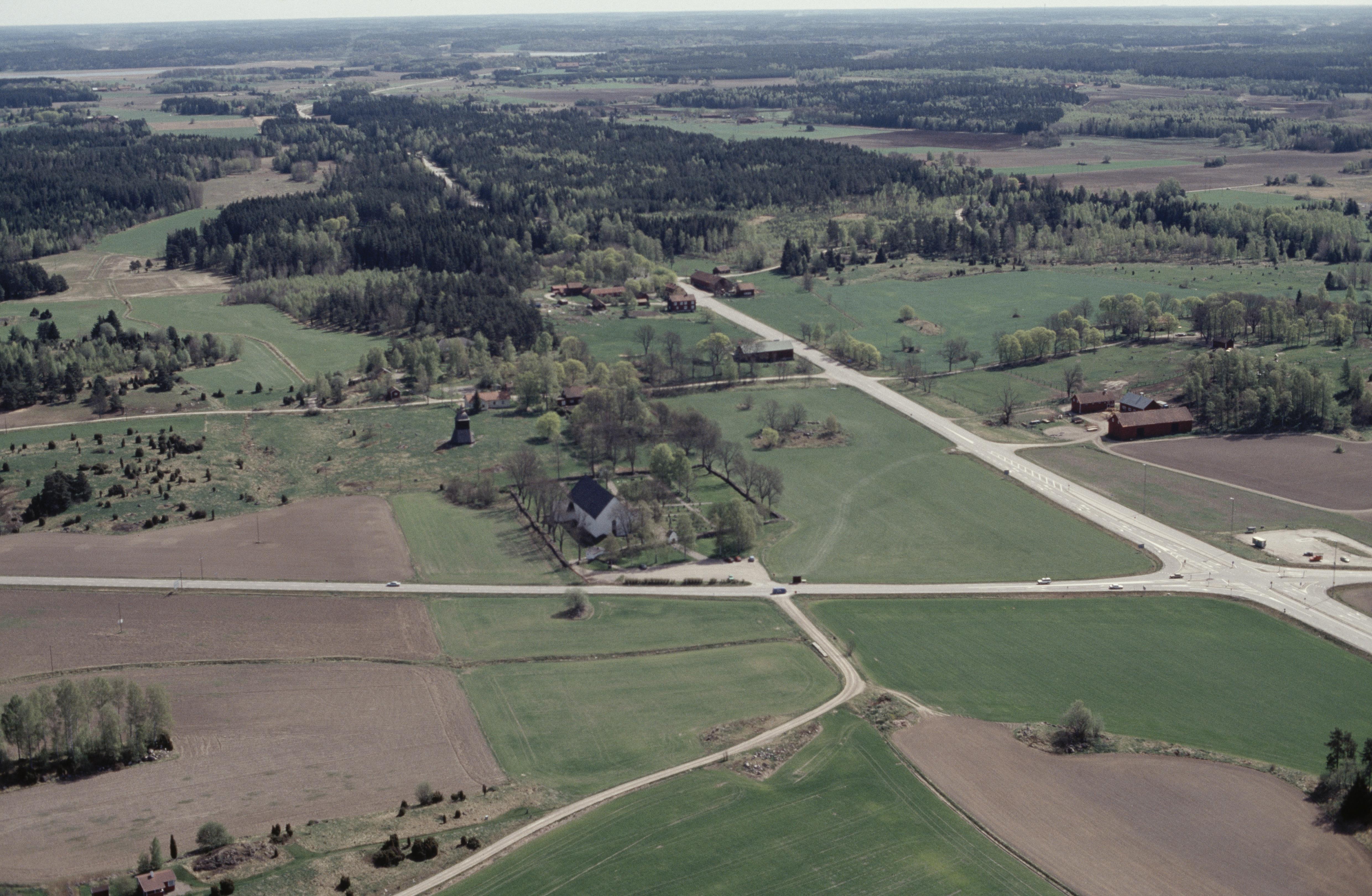 Beskrivning: Litslena kyrka vid gamla väg E18. Nere till vänster fornlämningsområdet Blomsterbacken med hällristningar och högar, bl.a. RAÄnr Litslena 149:1-2, 423:1-3, Bilden är tagen mot (väderstreck): Ö