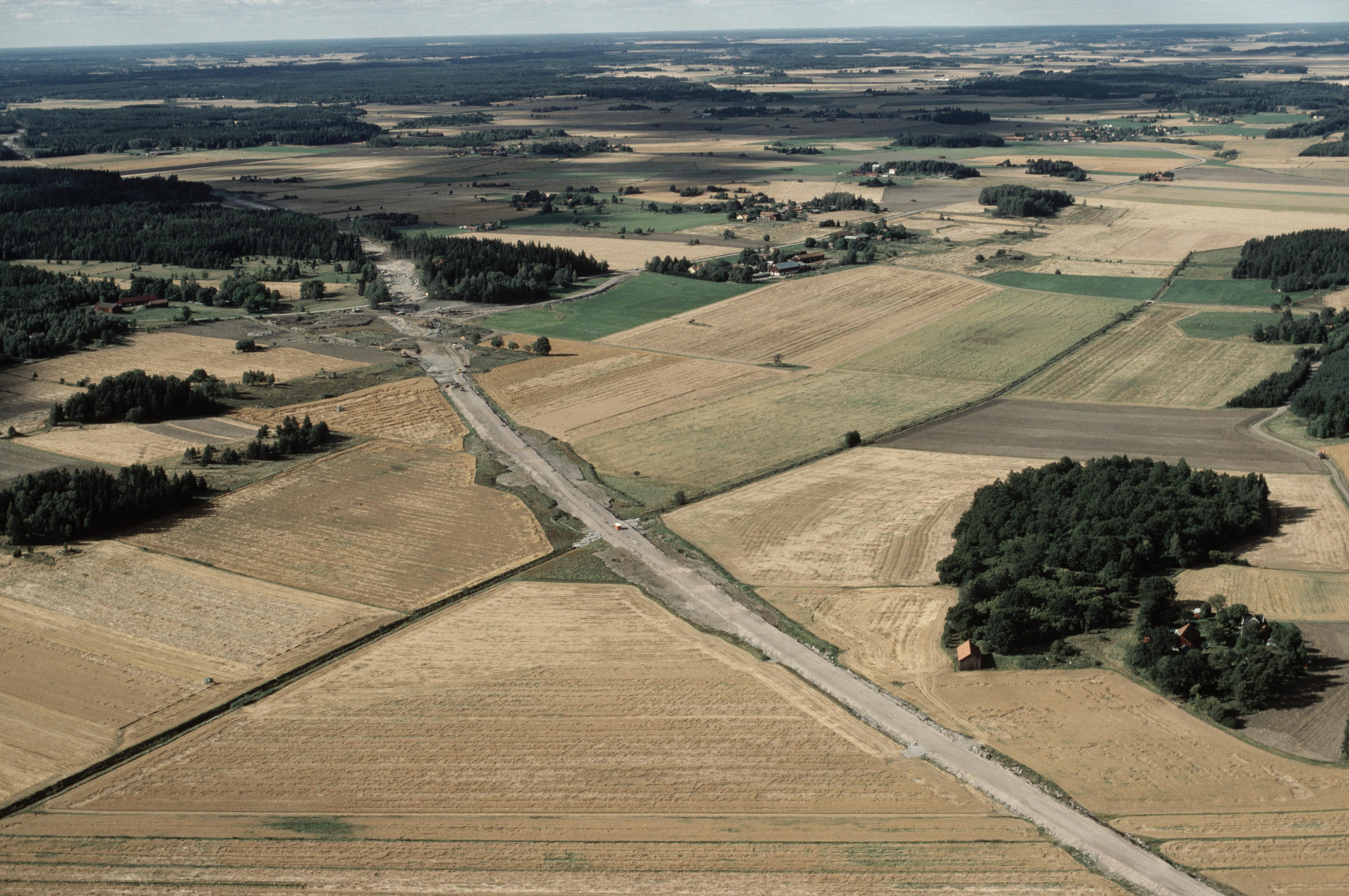 Beskrivning: Arkeologisk undersökning i samband med bygge av väg E18 vid Skäggesta. I bildens övre del Knoppbacka, Fiskvik och Tibble m.m. Till vänster om bildens mitt boplats med hägnad RAÄnr Litslena 485:1-2. I bildens nedre del gränsen mot Villberga socken längs Fiskviks kanal. Bilden är tagen mot (väderstreck): NV
