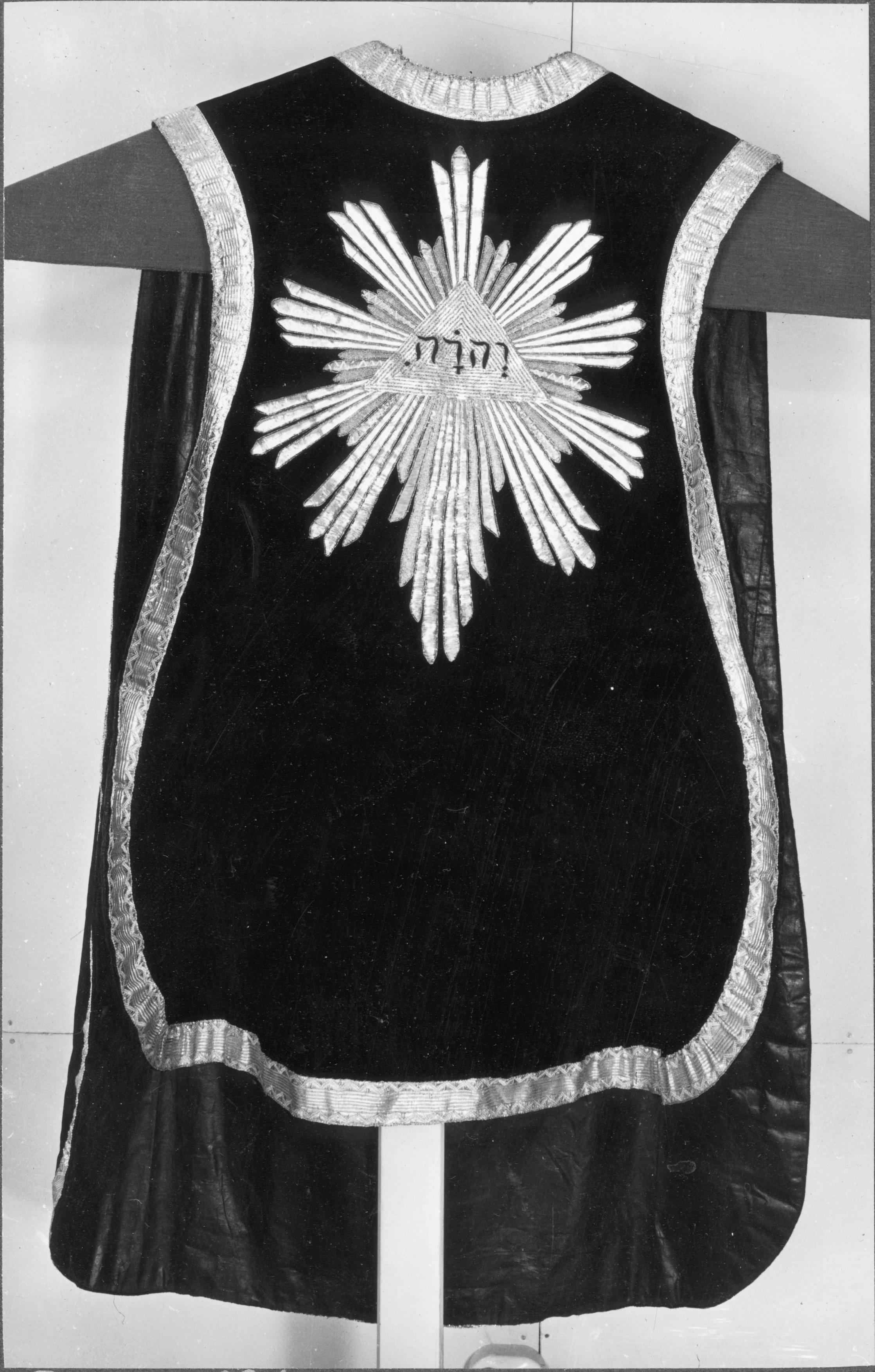 Beskrivning: Mässhake av svart sammet, på framsidan öga med sol.