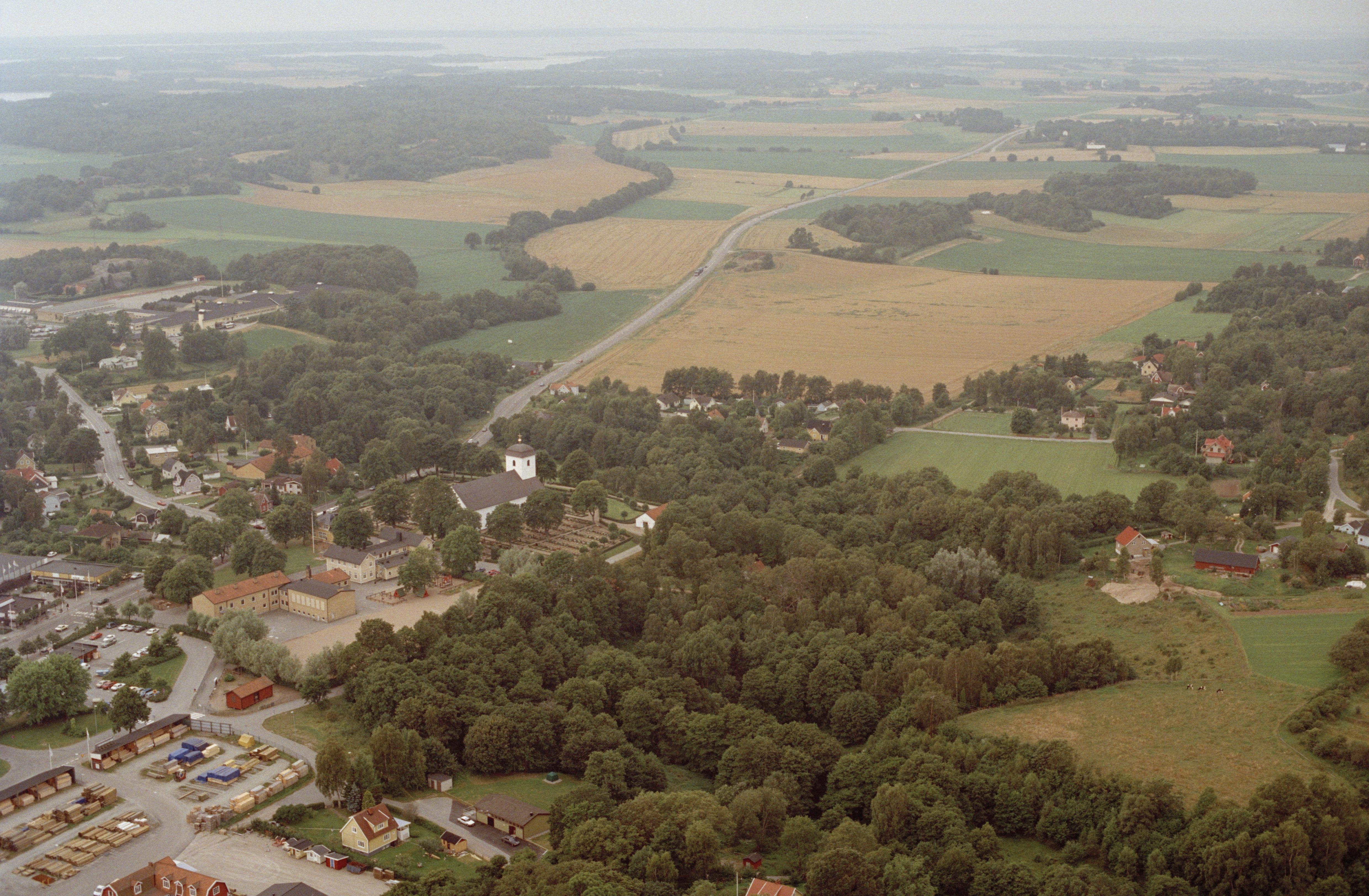 Beskrivning: Jämjö tätort. Jämjö kyrka vid bildens mitt. Bilden är tagen mot (väderstreck): SV