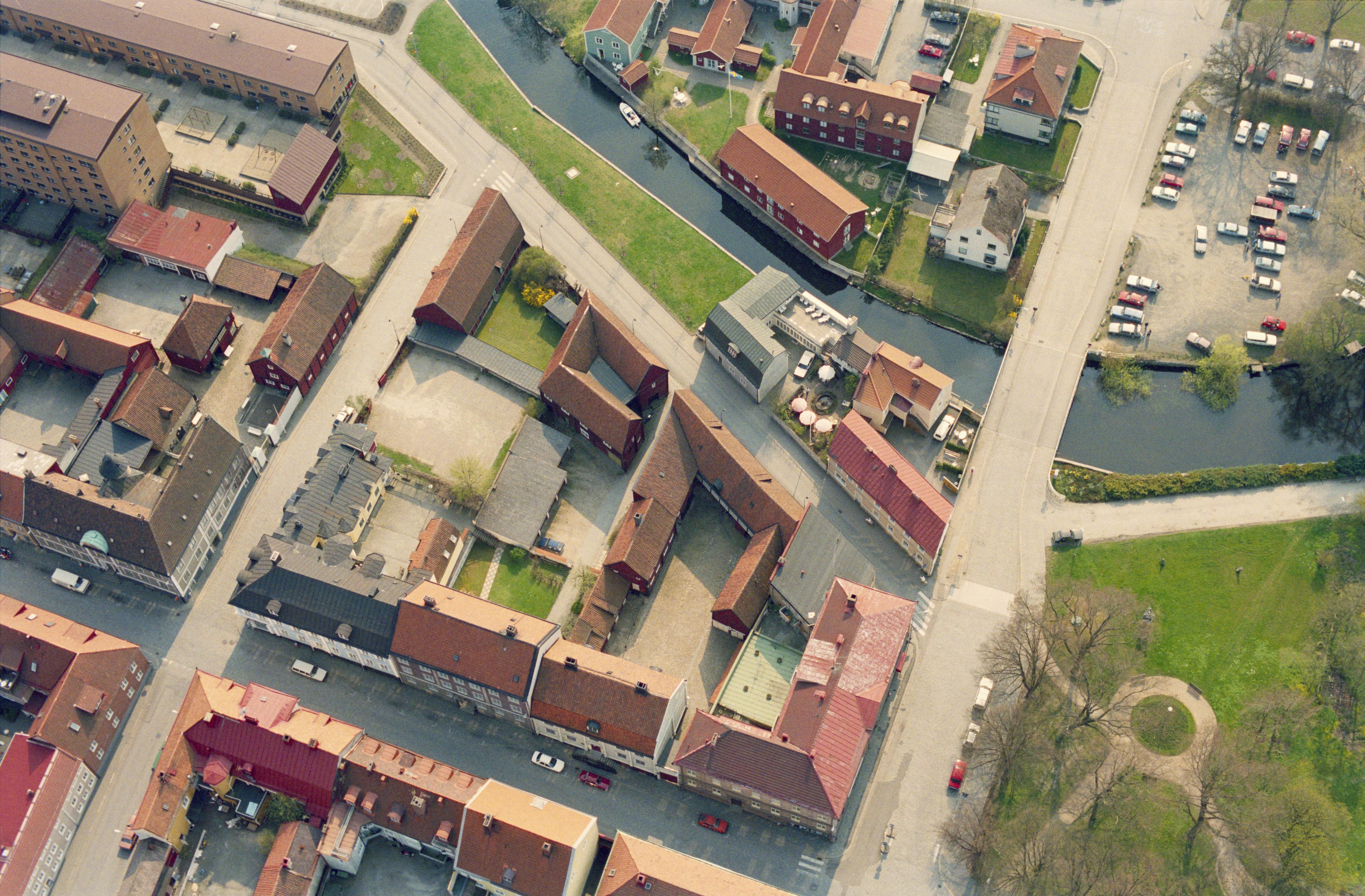 Beskrivning: Karlshamns stad. Byggnadsminnet Borgargården / Skottbergska gården RAÄnr Karlshamn 15:1 i bildens övre del. Bilden är tagen mot (väderstreck): V