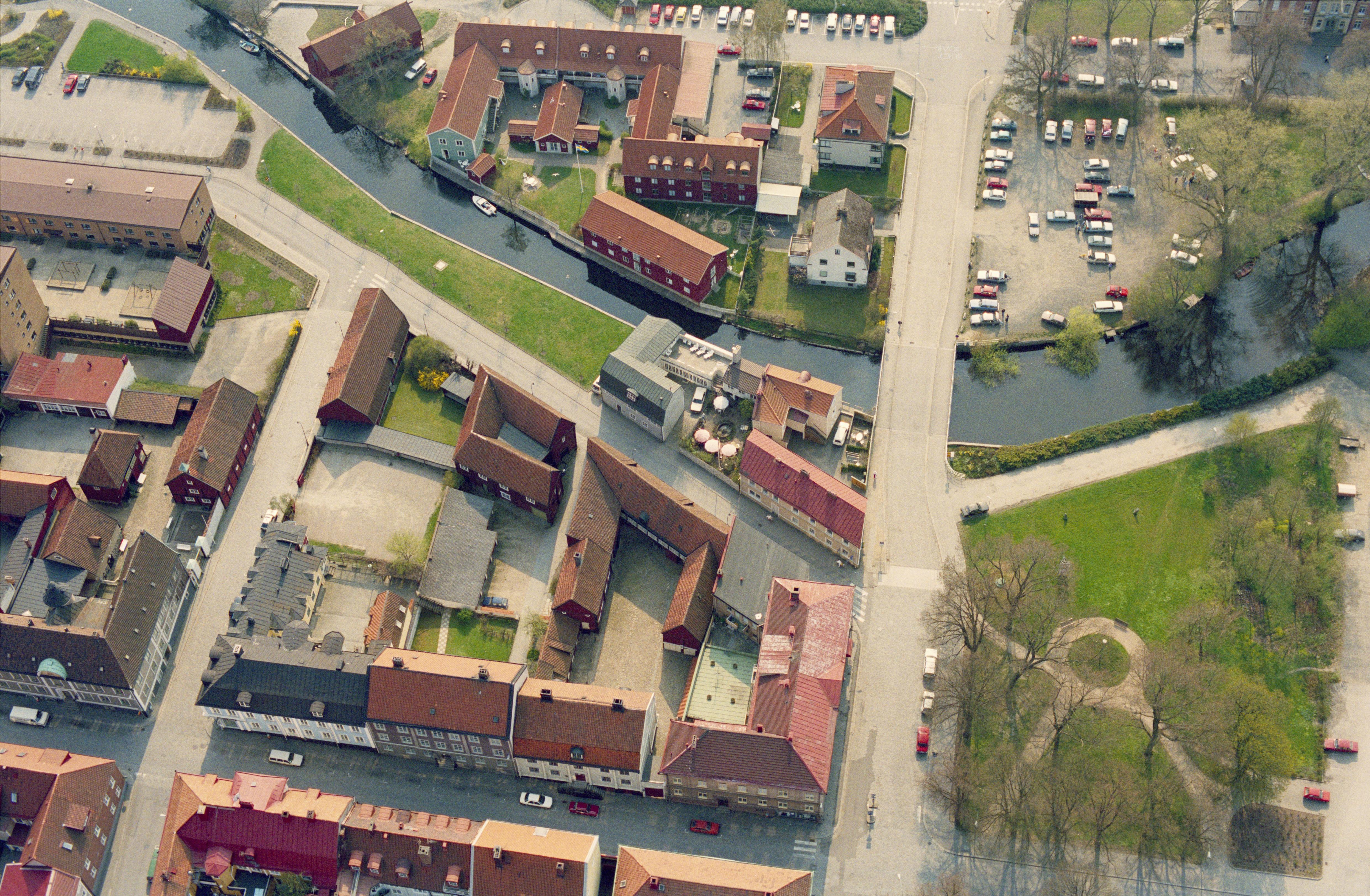 Beskrivning: Karlshamns stad. Byggnadsminnet Borgargården / Skottbergska gården RAÄnr Karlshamn 15:1 i bildens övre del. Bilden är tagen mot (väderstreck): V