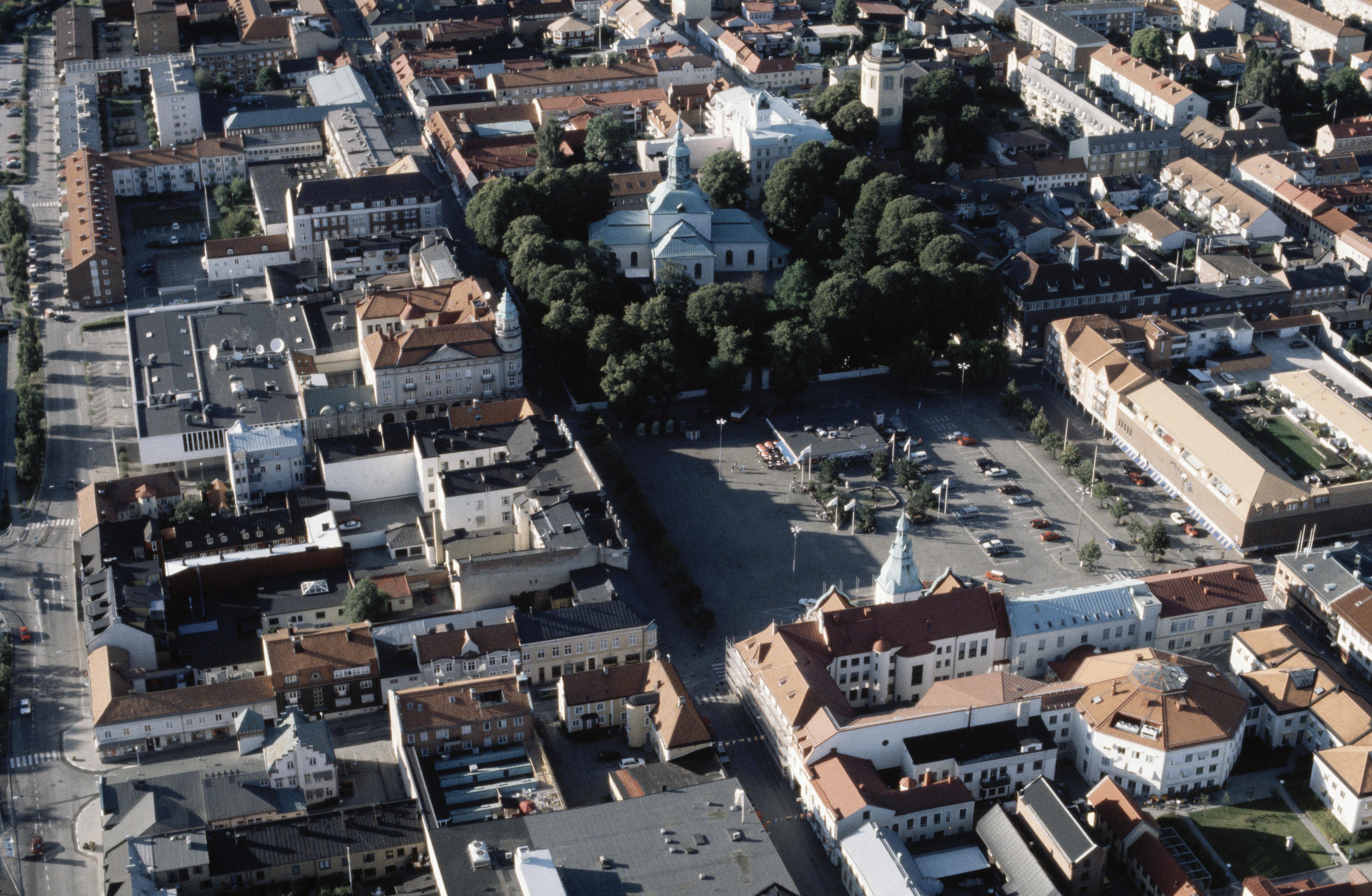 Beskrivning: Karlshamns stad. Carl Gustafs kyrka i bildens övre del. Bilden är tagen mot (väderstreck): N