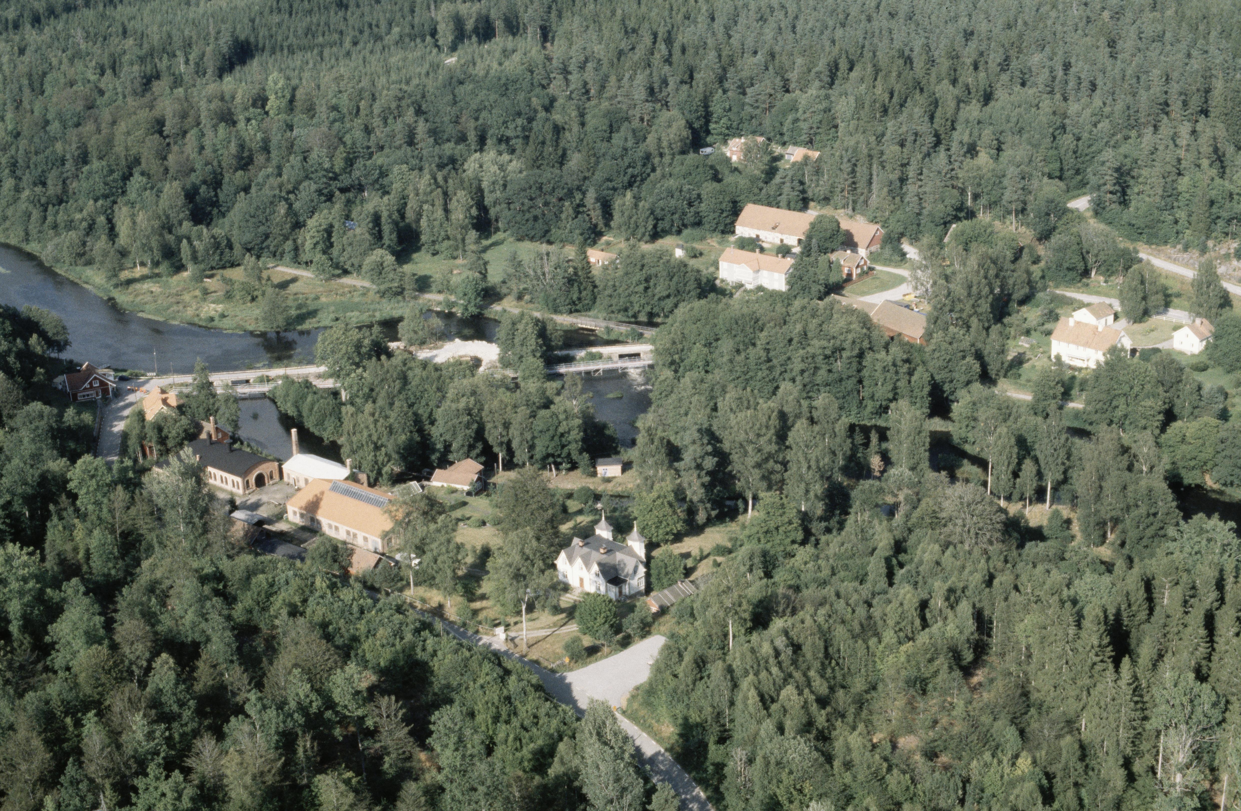 Beskrivning: Vid Mörrumsån som markerar gränsen mellan socknen Kyrkhult och Ringemåla (i bildens övre del). Ebbemåla bruk. Bilden är tagen mot (väderstreck): N