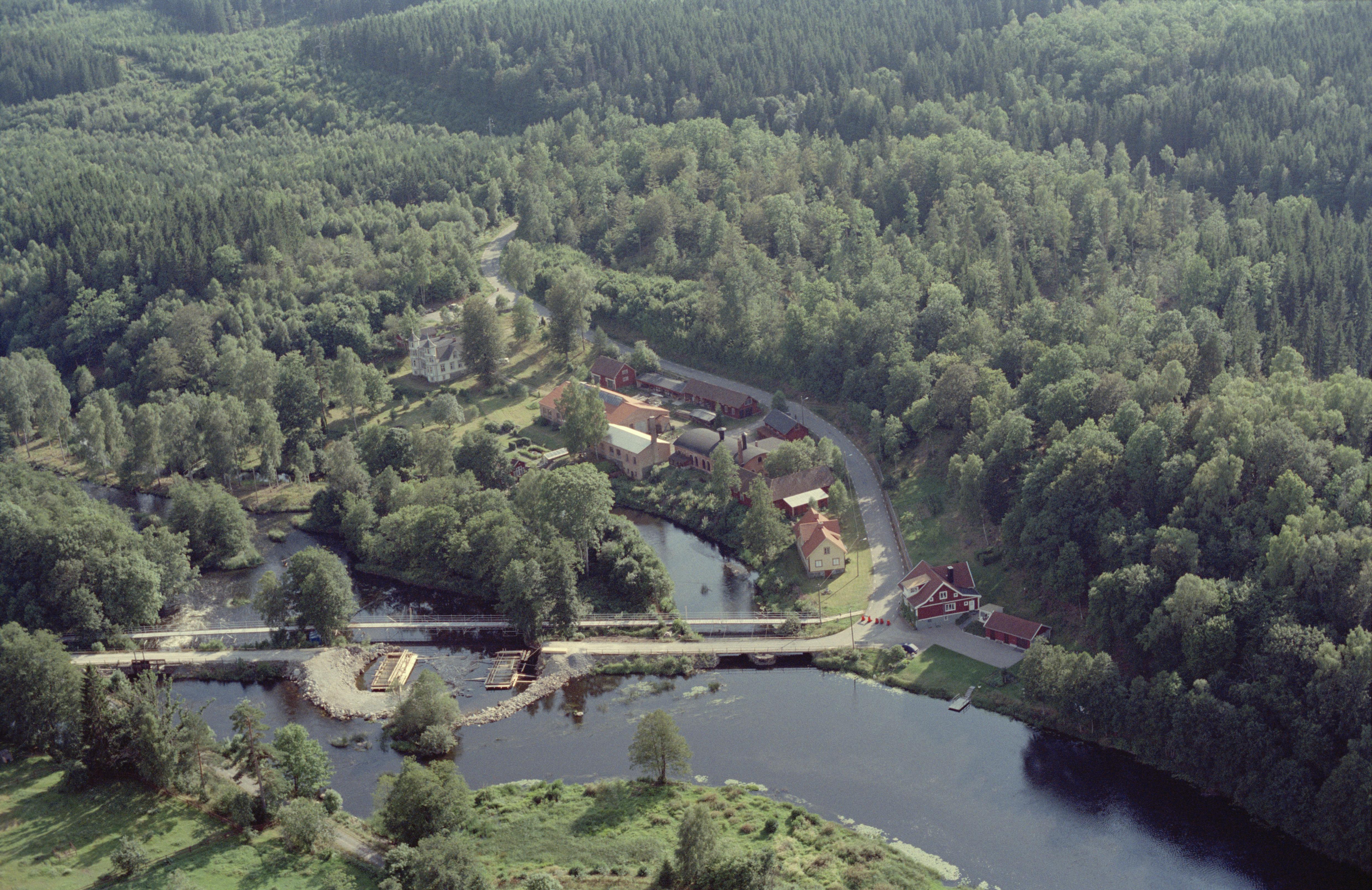 Beskrivning: Vid Mörrumsån som markerar gränsen mellan socknen Kyrkhult och Ringemåla (i bildens nedre del). Ebbemåla bruk och gjuteri. Bilden är tagen mot (väderstreck): SV