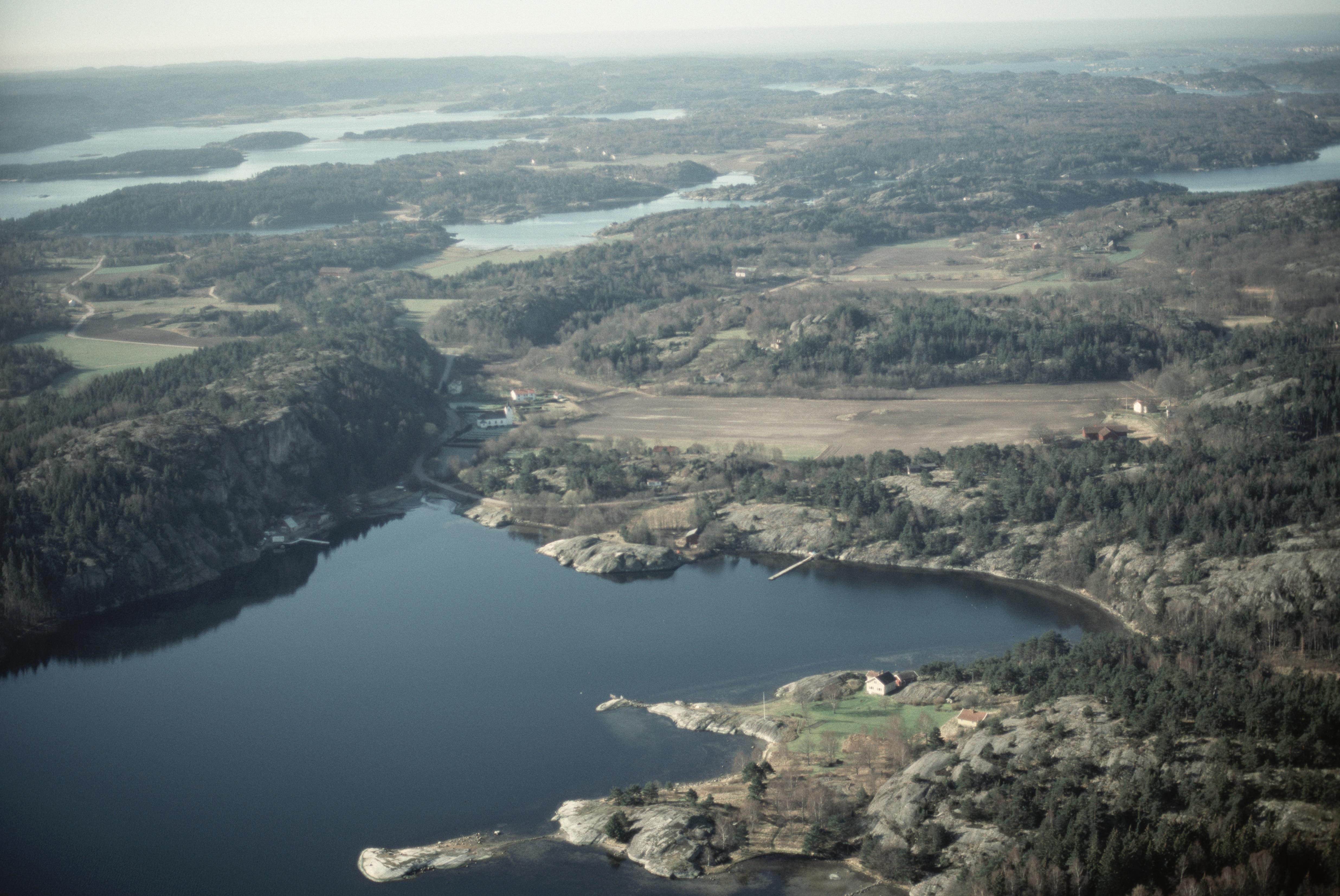 Beskrivning: Till vänster om bildens mitt Dragsmarks kyrka och klosterruin RAÄnr Dragsmark 2:1 vid viken Rörbäcke kile i Koljö fjord. Bilden är tagen mot (väderstreck): SV