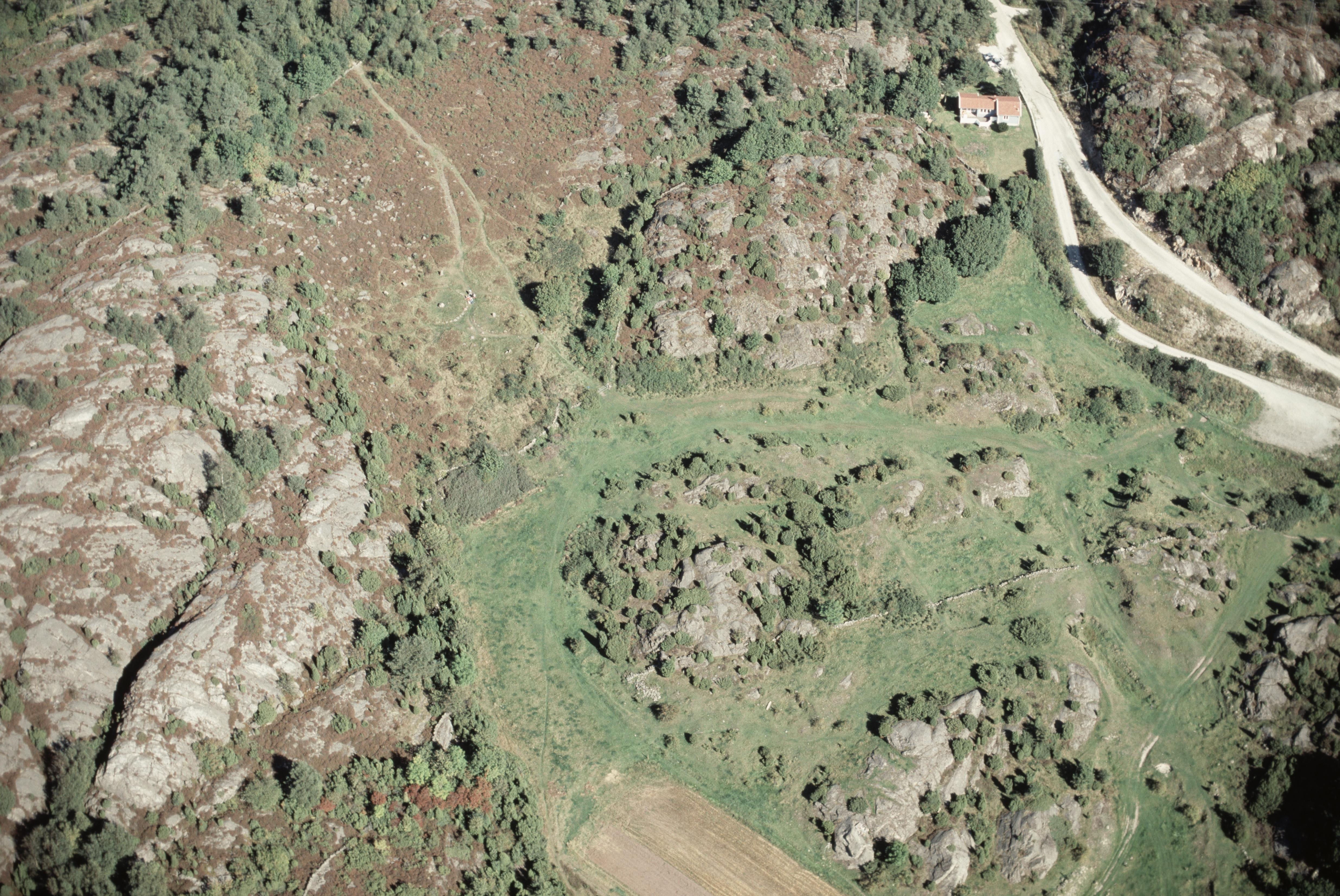 Beskrivning: Gravfält Pilane RAÄnr Klövedal 105:1. Daterat till järnåldern och består av ett 90-tal fornlämningar, bl.a. högar, resta stenar, stensättningar och domarringar. Bilden är tagen mot (väderstreck): NO