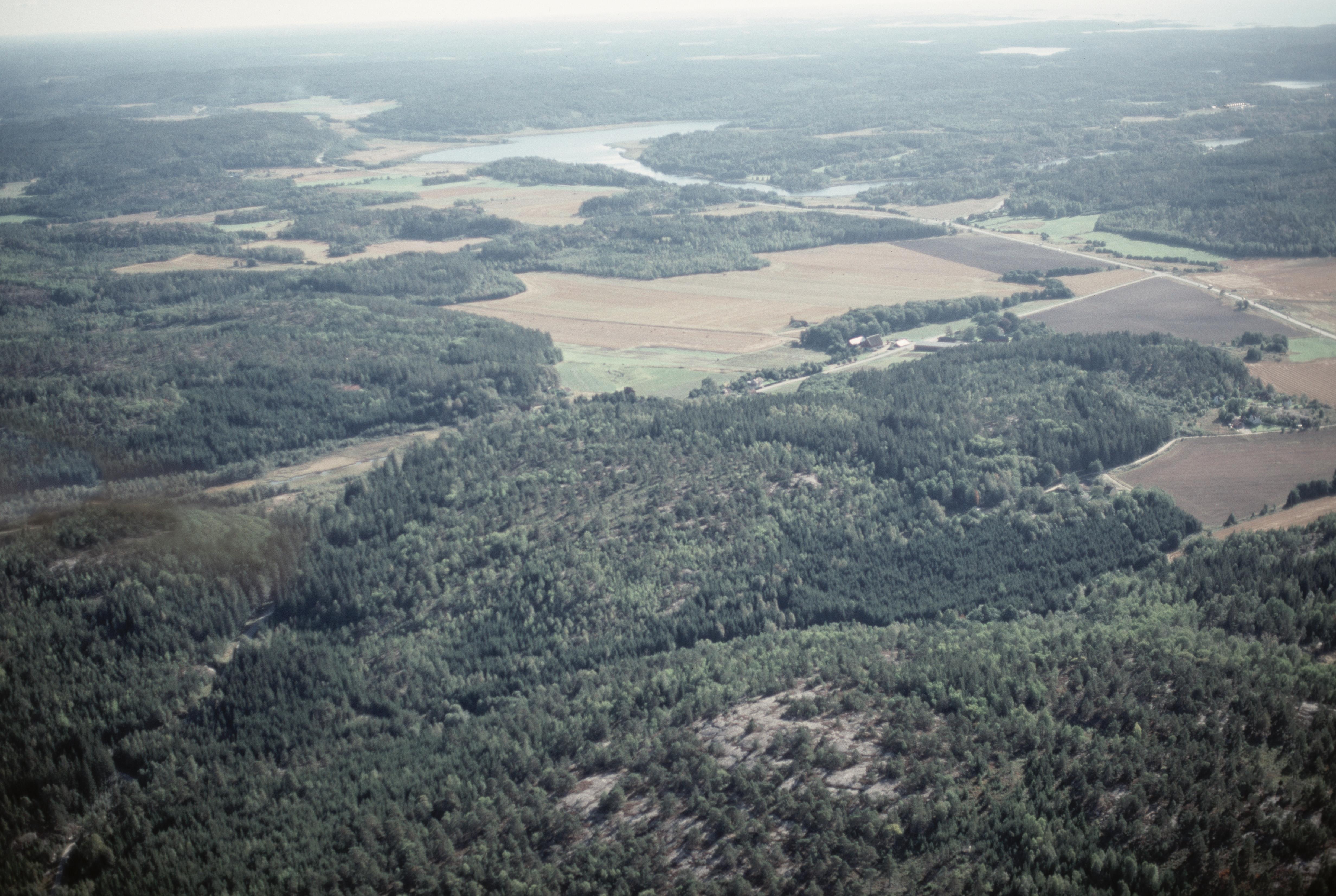 Beskrivning: Dalgången från Hoppareberget mot sjön Färingen. Bytomt RAÄnr Skee 1500:1 och boplats 1592:1 vid bildens mitt. Till höger över bildens mitt Blomsholms herrgård. Bilden är tagen mot (väderstreck): NO