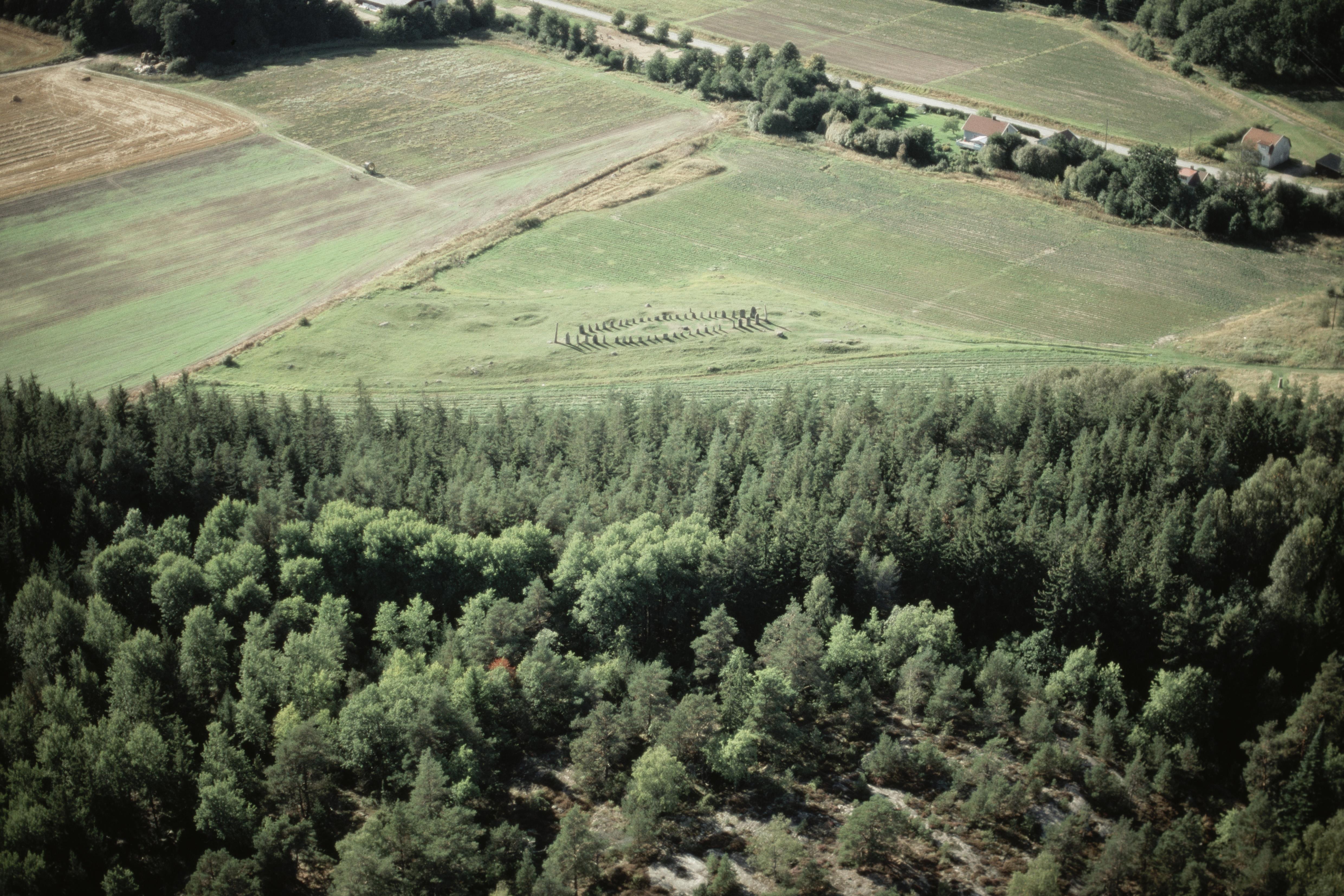 Beskrivning: Blomsholms herrgård uppe till vänster. Gravfält med skeppssättning RAÄnr Skee 343:1 och hällristning Skee 1563:1 vid bildens mitt. Bilden är tagen mot (väderstreck): VSV