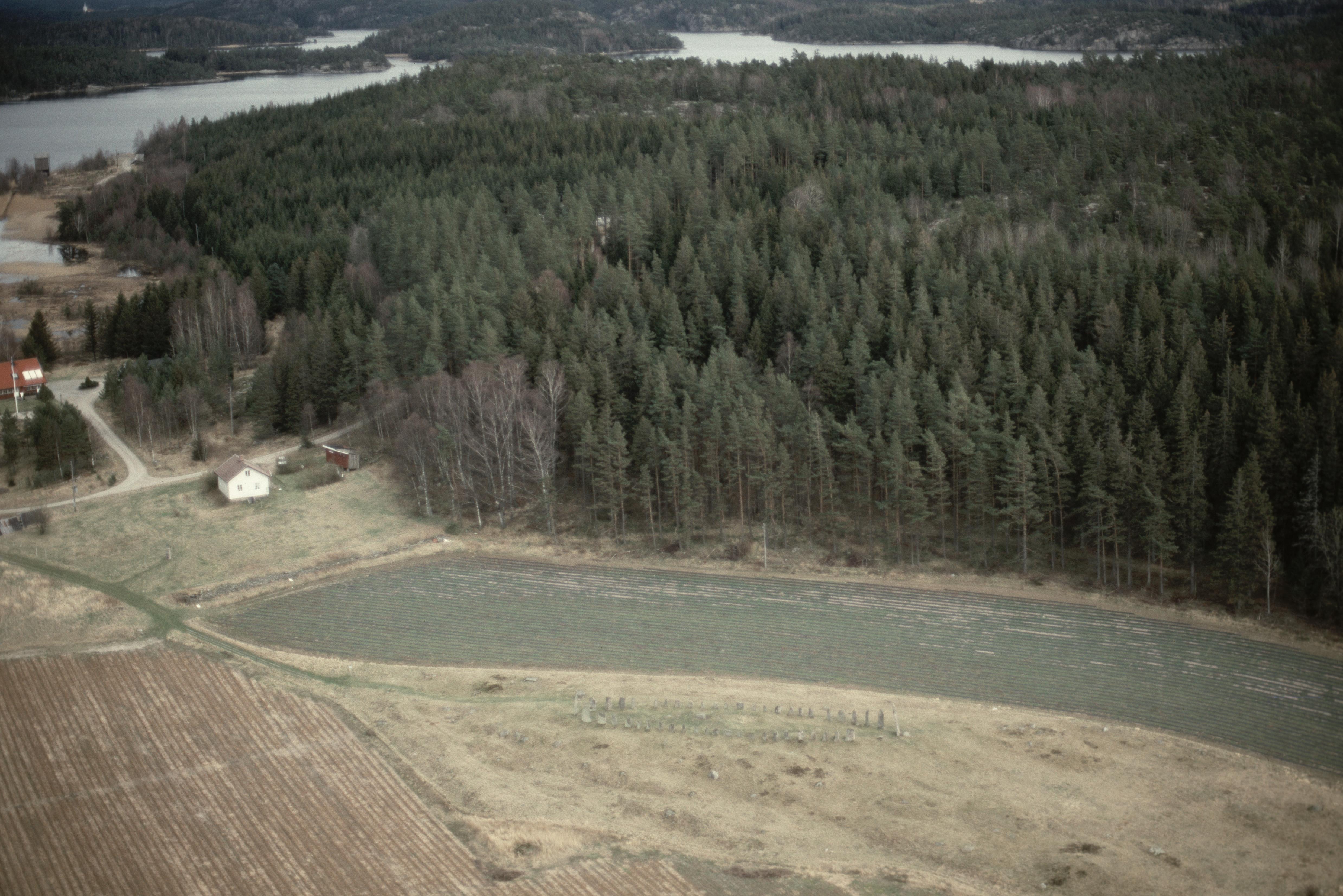 Beskrivning: Blomsholms by och herrgård. Gravfält med skeppssättning RAÄnr Skee 343:1 och hällristning Skee 1563:1 under bildens mitt. I bildens övre del sjön Färingen. Bilden är tagen mot (väderstreck): ONO