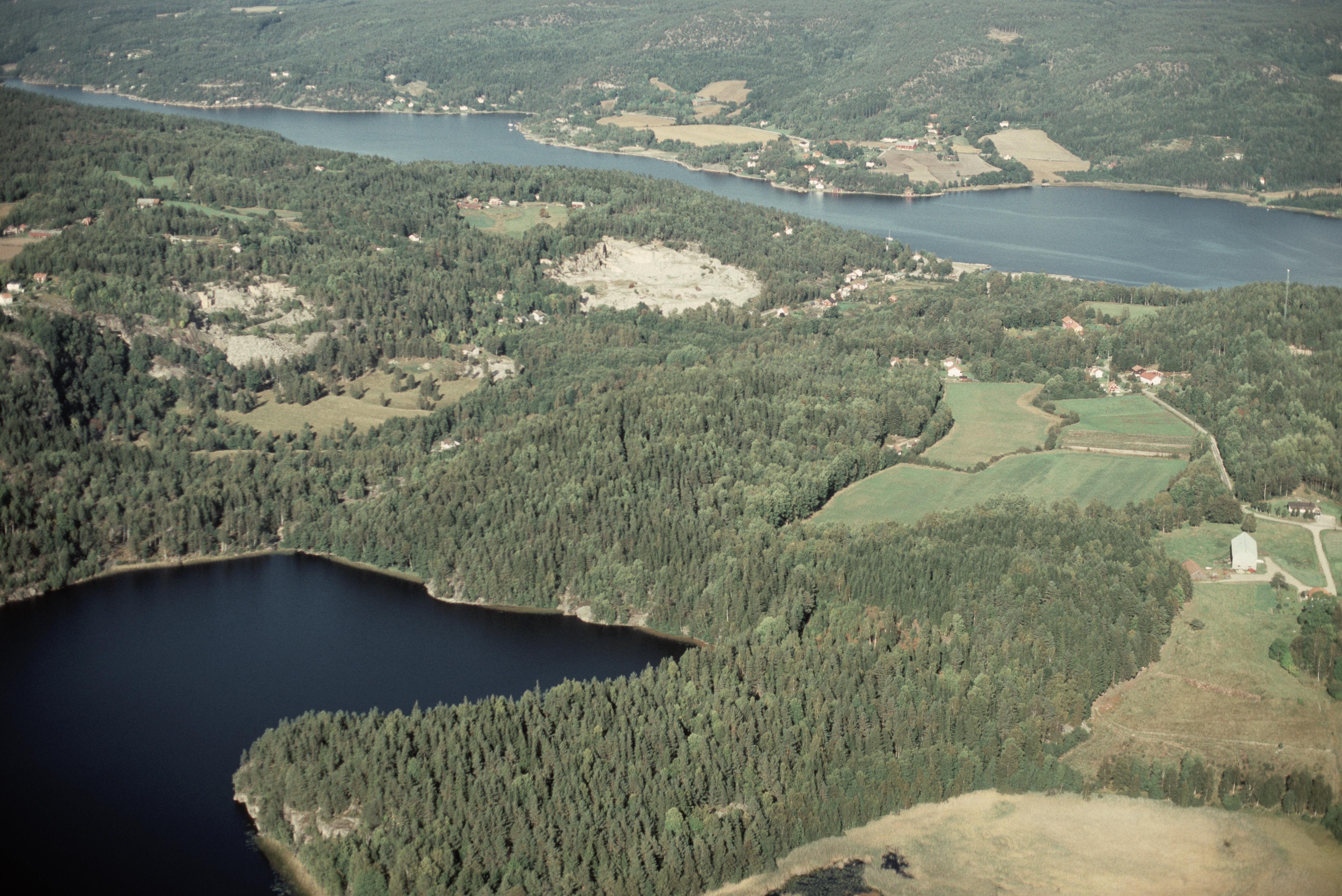 Beskrivning: Krokstrands stenhuggarsamhälle vid Idefjorden. Hög RAÄnr Skee 412:1-3 och hällristning Skee 650:1 vid bildens mitt. Kroktjärnet nere till vänster. Bilden är tagen mot (väderstreck): ONO