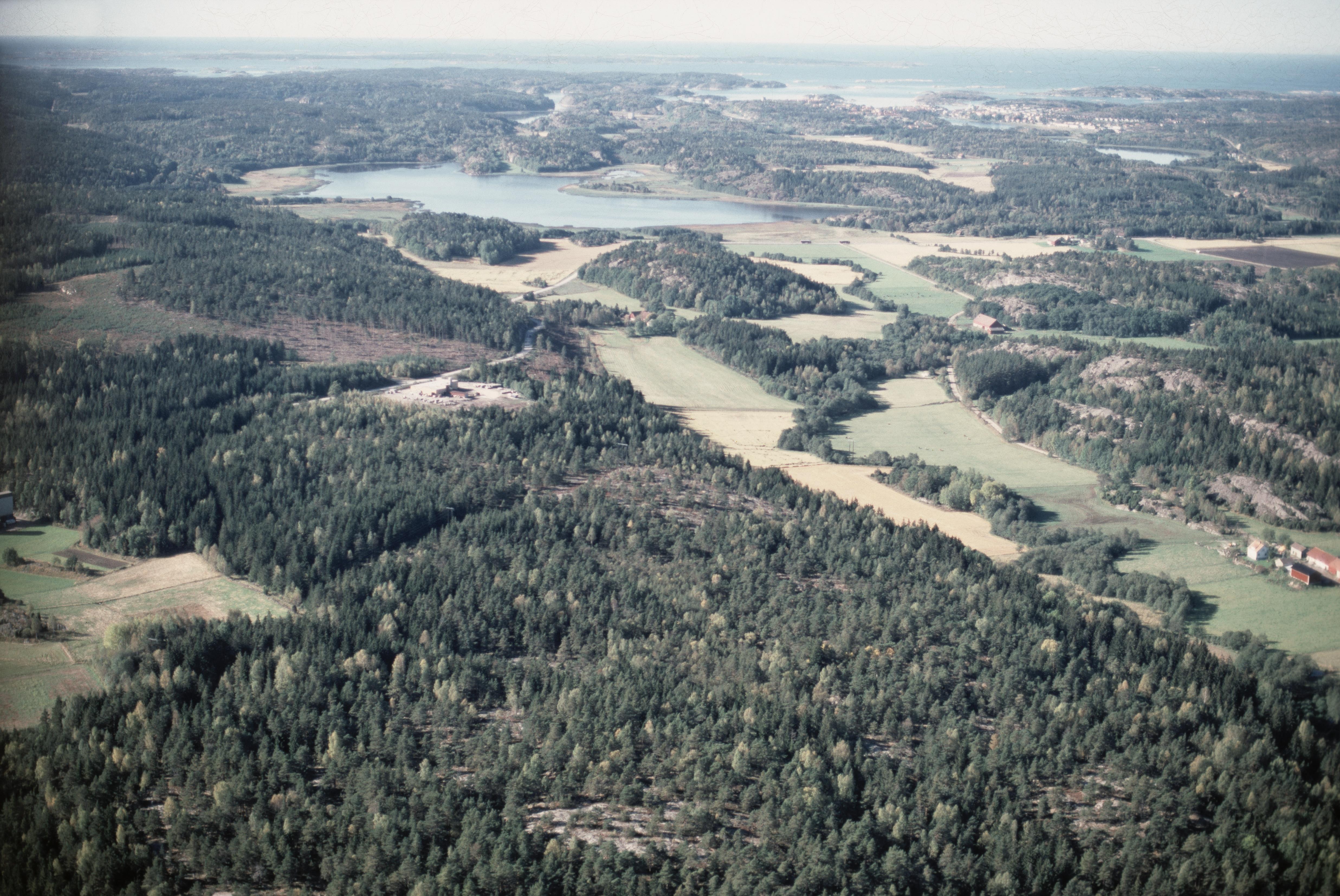 Beskrivning: Domarring / stenkrets RAÄnr Skee 129:1 vid gården Övre Ejgst i bildens mitt. I bildens övre del Strömsvattnet. Bilden är tagen mot (väderstreck): V