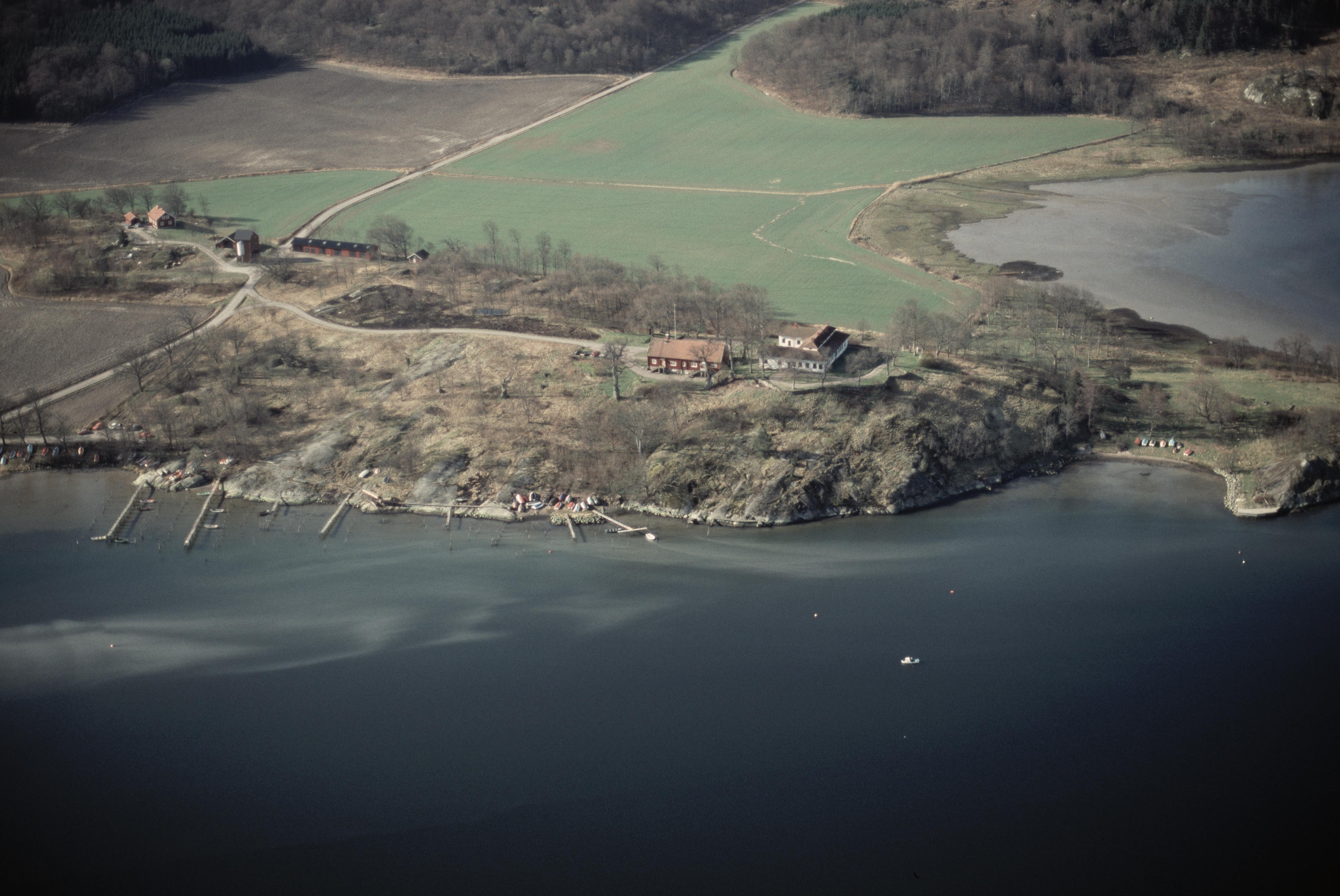 Beskrivning: Gullmarsbergs herrgård / säteri. Till vänster Dyngö ruin (Dyngehus borg) RAÄnr Skredsvik 146:1 och 254:1 vid Gullmarsvik i sjön Gullmarn. Bilden är tagen mot (väderstreck): SV