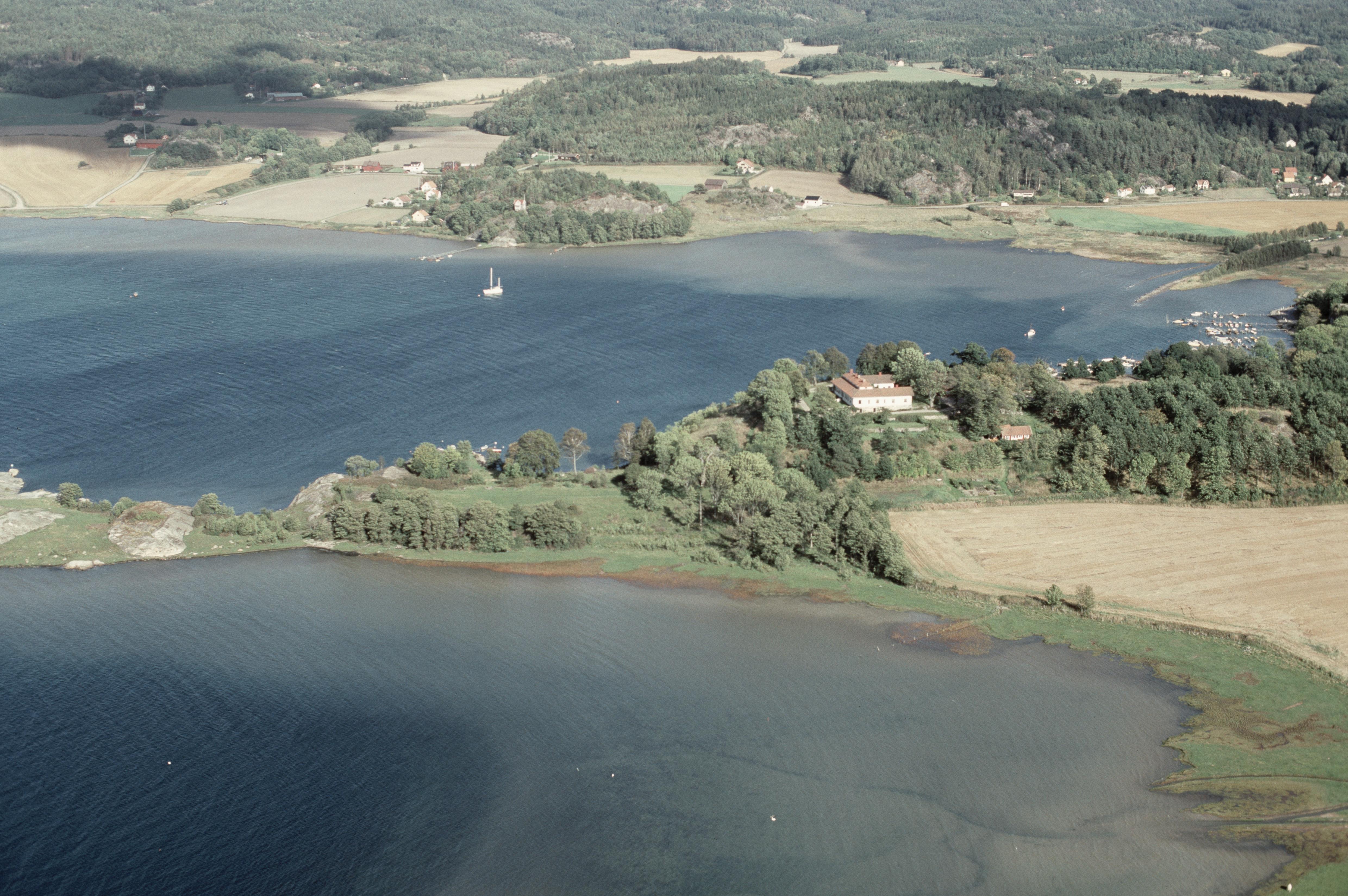 Beskrivning: Gullmarsbergs herrgård / säteri. I bildens övre del Dyngö ruin (Dyngehus borg) RAÄnr Skredsvik 146:1 och 254:1 vid Gullmarsvik i sjön Gullmarn. Bilden är tagen mot (väderstreck): ONO