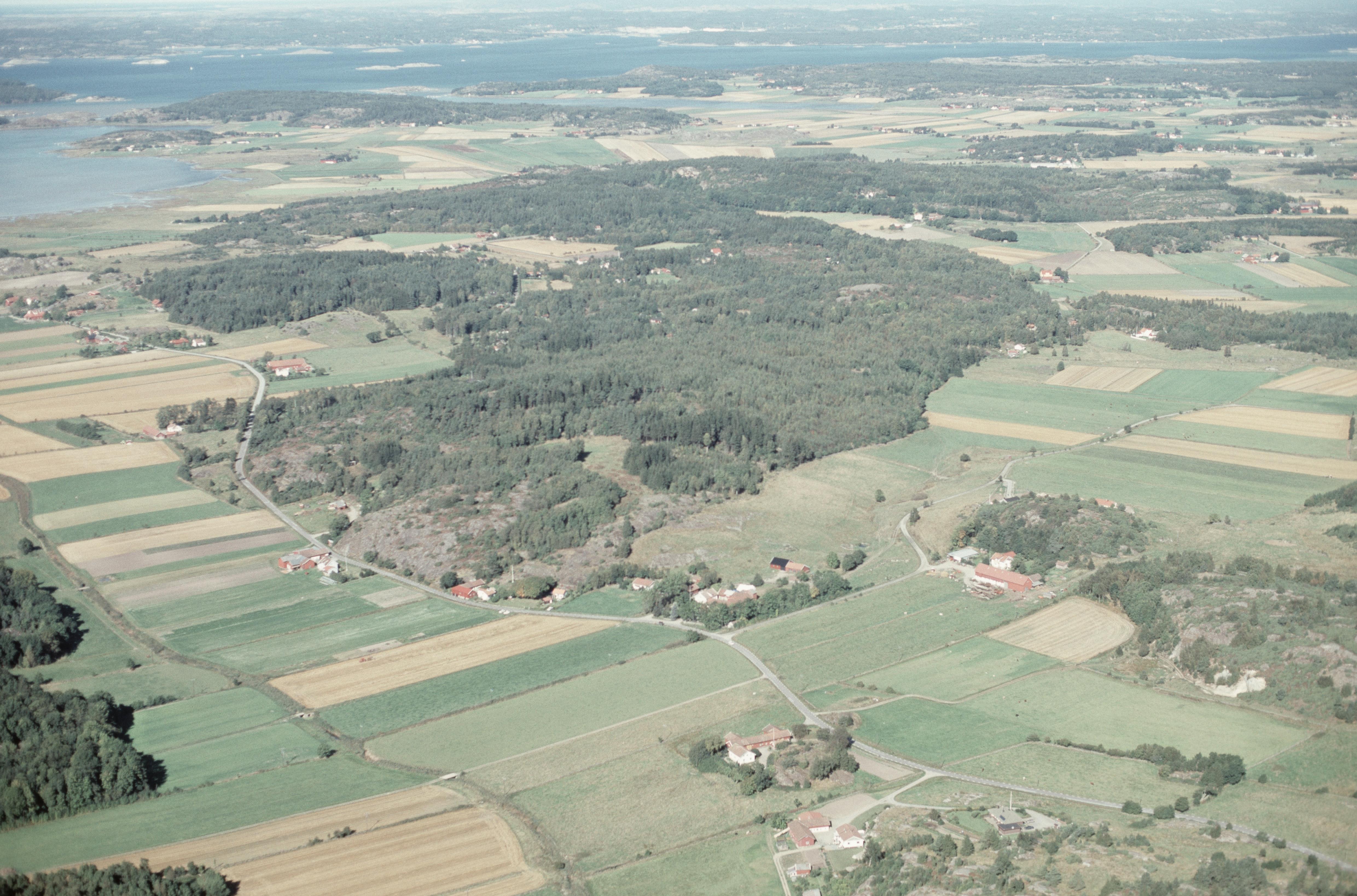 Beskrivning: Grannebyåns dalgång. Vid bildens mitt gravfält RAÄnr Hålta 12:1 m.fl. I bildens övre del till vänster Ödsmål och viken Ödsmåls kile i Solberga socken. Bilden är tagen mot (väderstreck): NV