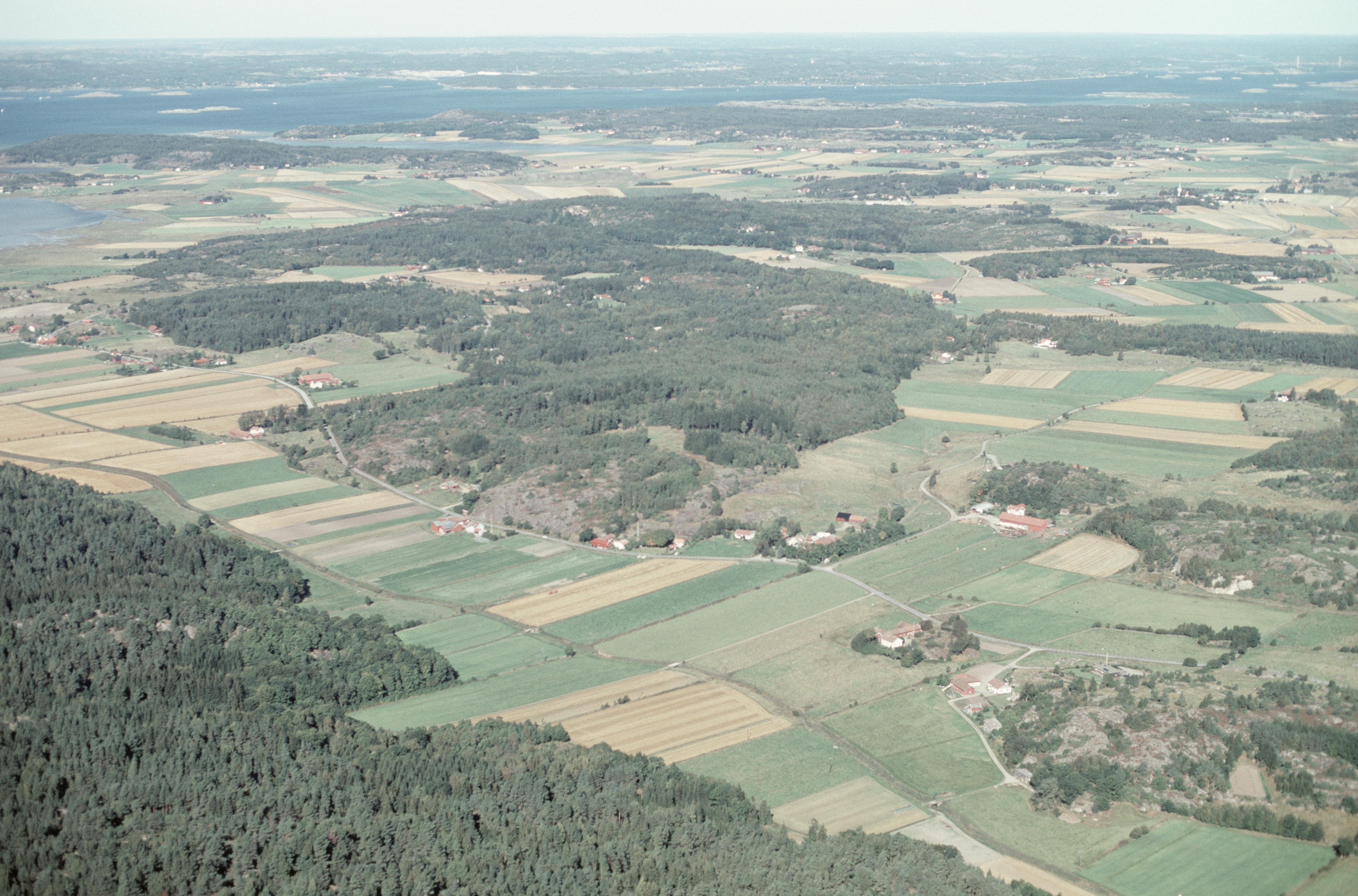 Beskrivning: Grannebyåns dalgång. Vid bildens mitt gravfält RAÄnr Hålta 12:1 m.fl. I bildens övre del till vänster Ödsmål och viken Ödsmåls kile i Solberga socken. Bilden är tagen mot (väderstreck): NV