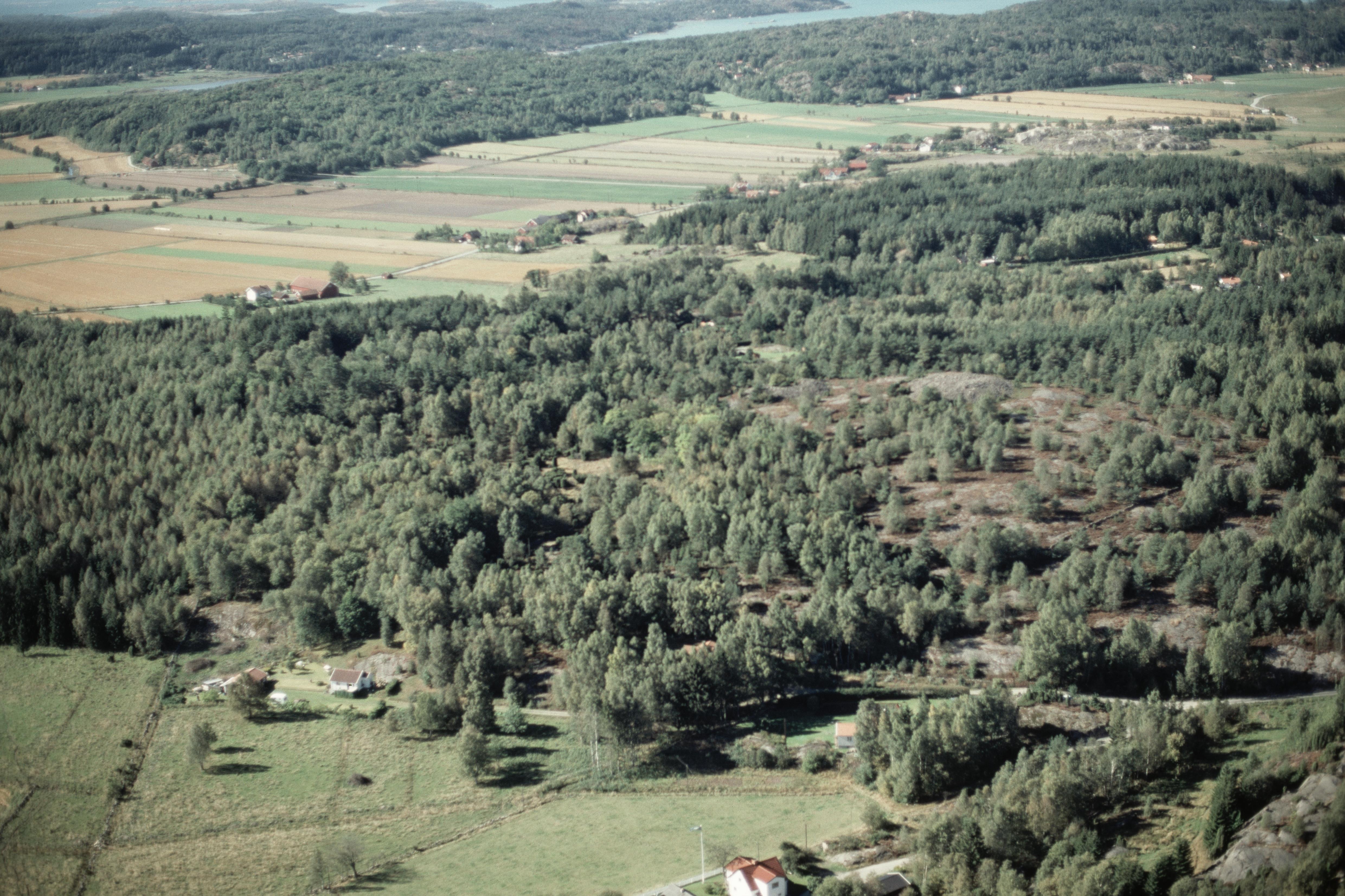 Beskrivning: Åseby storrösen RAÄnr Solberga 134:1 på Åsebyberg i bildens nedre del. I bildens övre del Ödsmål och Ödsmåls mosse. Bilden är tagen mot (väderstreck): SV