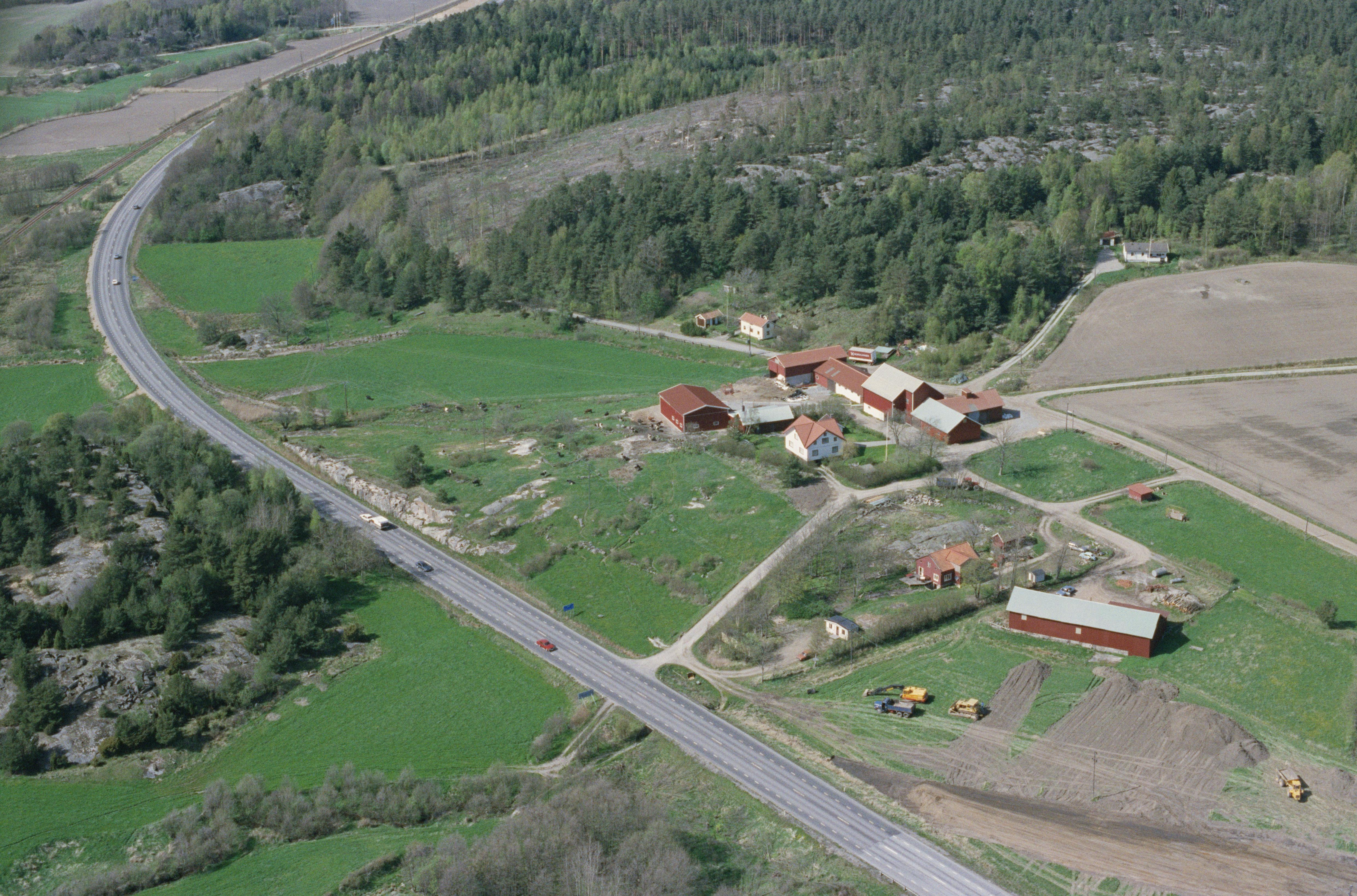 Beskrivning: Vid bildens mitt arkeologisk undersökning vid Larsgården. Boplats RAÄnr Tanum 1601:1 och hällristningar Tanum 469:1-2 m.fl. Uppe till vänster området vid Tannamskilen. Bilden är tagen mot (väderstreck): NNV