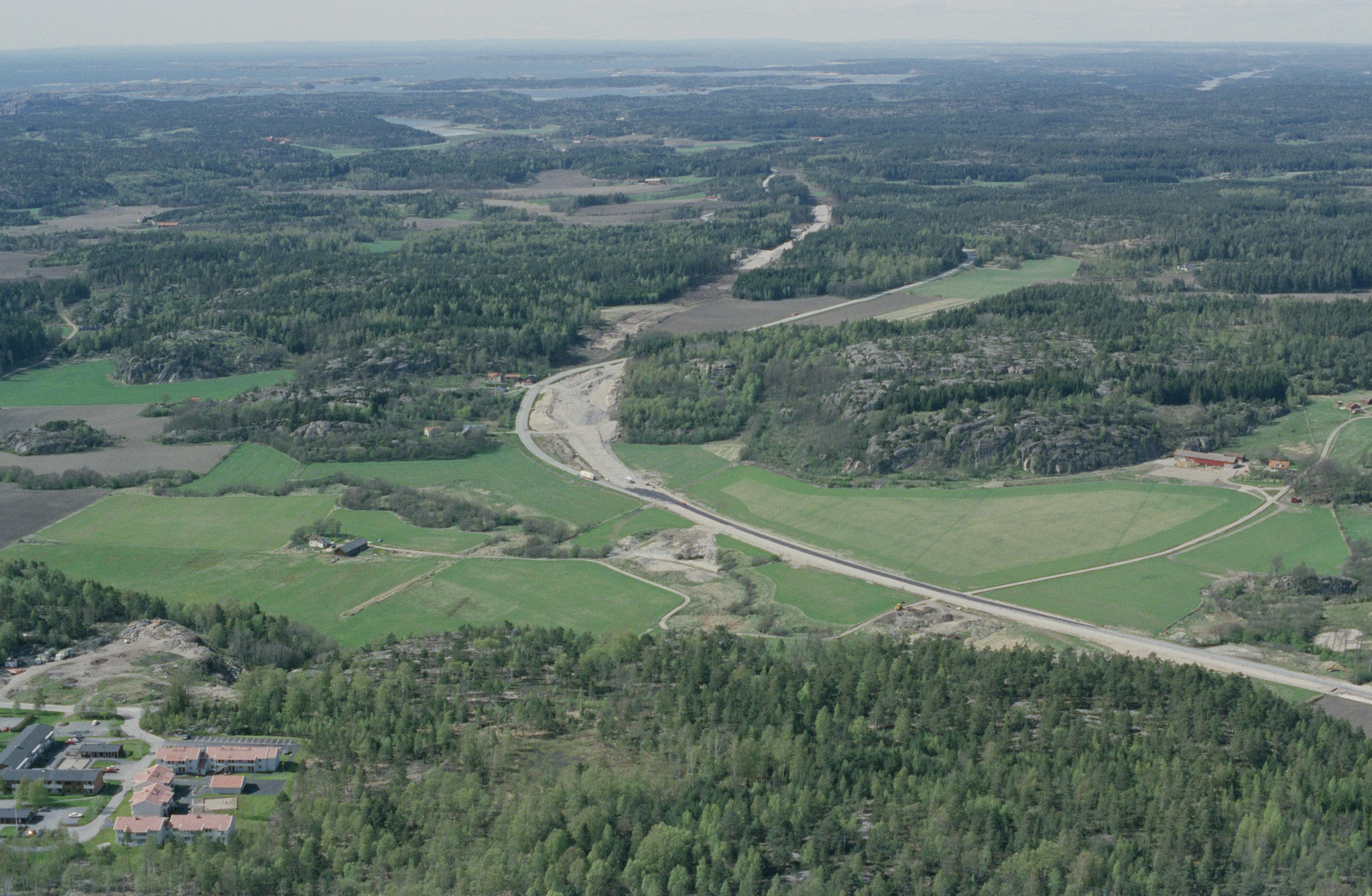 Beskrivning: Område med arkeologiska undersökningar i samband med vägbygge (väg E6). Rörängen och boplats RAÄnr Tanum 1831:1 under bildens mitt. I bildens övre del Präste-Säm. Bilden är tagen mot (väderstreck): NV