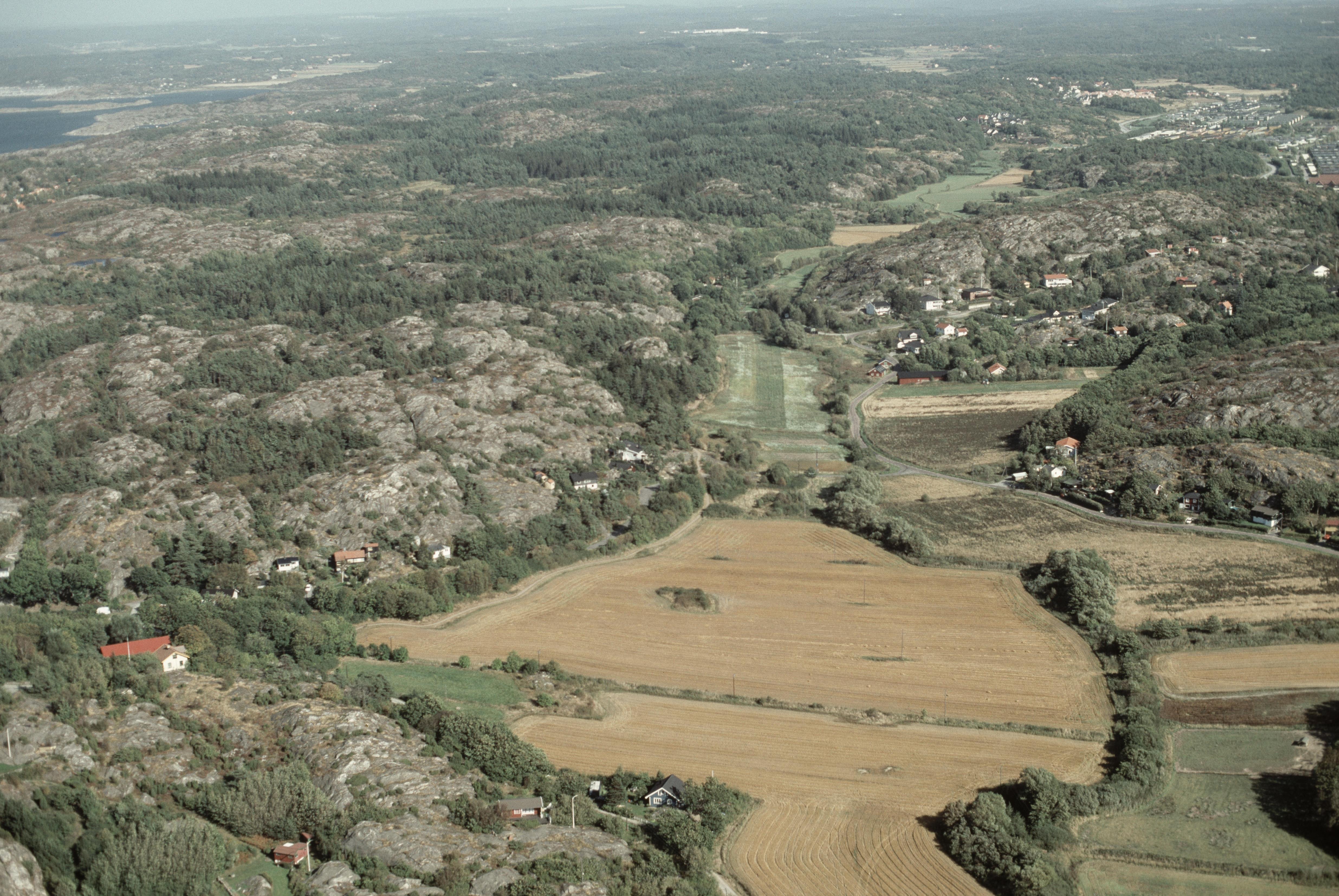 Beskrivning: Madbäckens dalgång i sydvästra delen av ön Hisingen. Hällmålningsberget RAÄnr Torslanda 216:1 till vänster om bildens mitt. Bilden är tagen mot (väderstreck): Ö