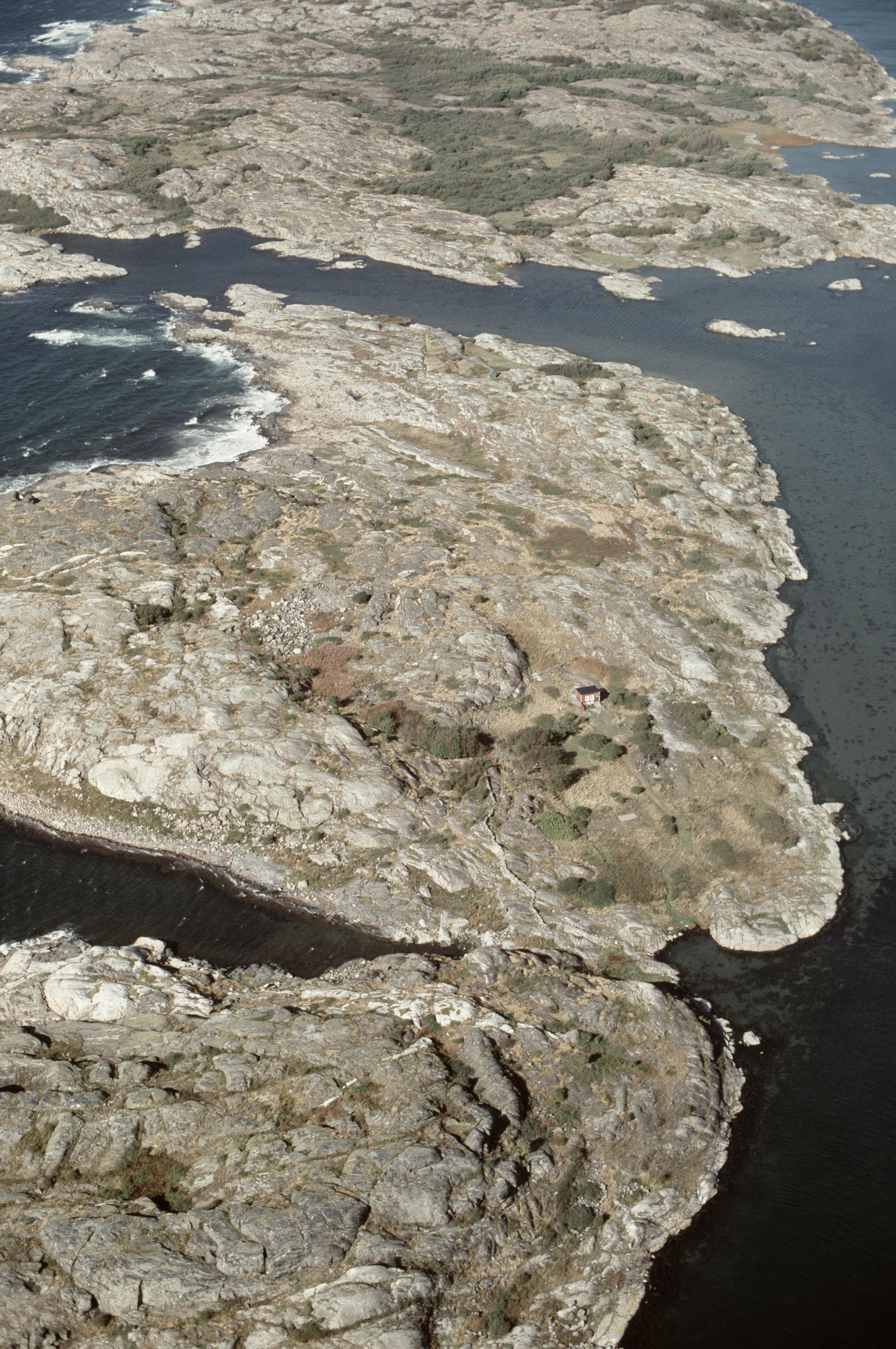 Beskrivning: Ön Ängholmen i Källö fjord. Offerkast RAÄnr Öckerö 100:1 och tomtningar Öckerö 98:1-3, 100:2 m.fl. vid bildens mitt. Bilden är tagen mot (väderstreck): N