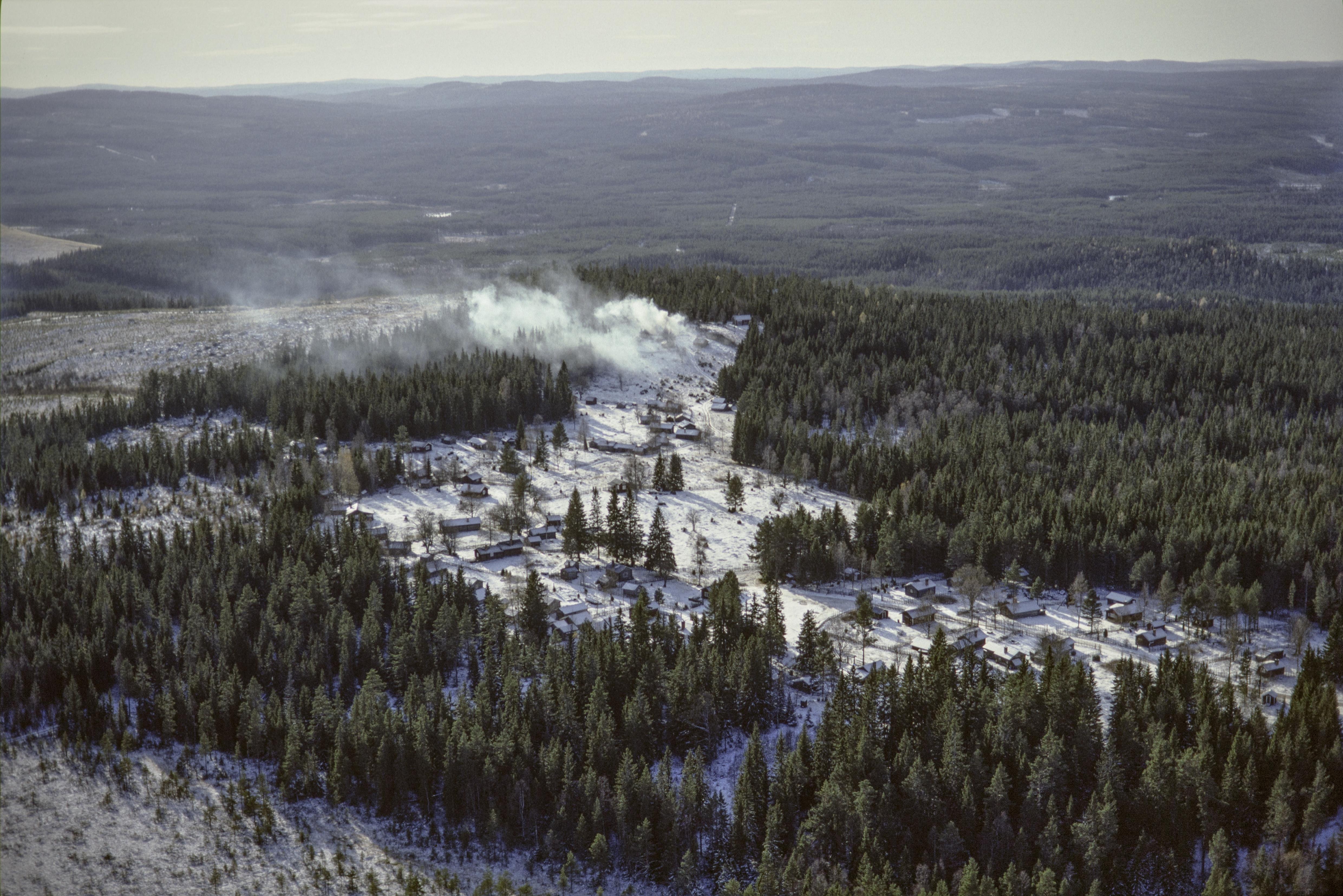 Beskrivning: Bastbergets fäbodmiljö RAÄnr Gagnef 39:1. Över bildens mitt fäbodar med nummer 101, 103, 105, 107 m.fl. i södra delen av byn. Bilden är tagen mot (väderstreck): SV