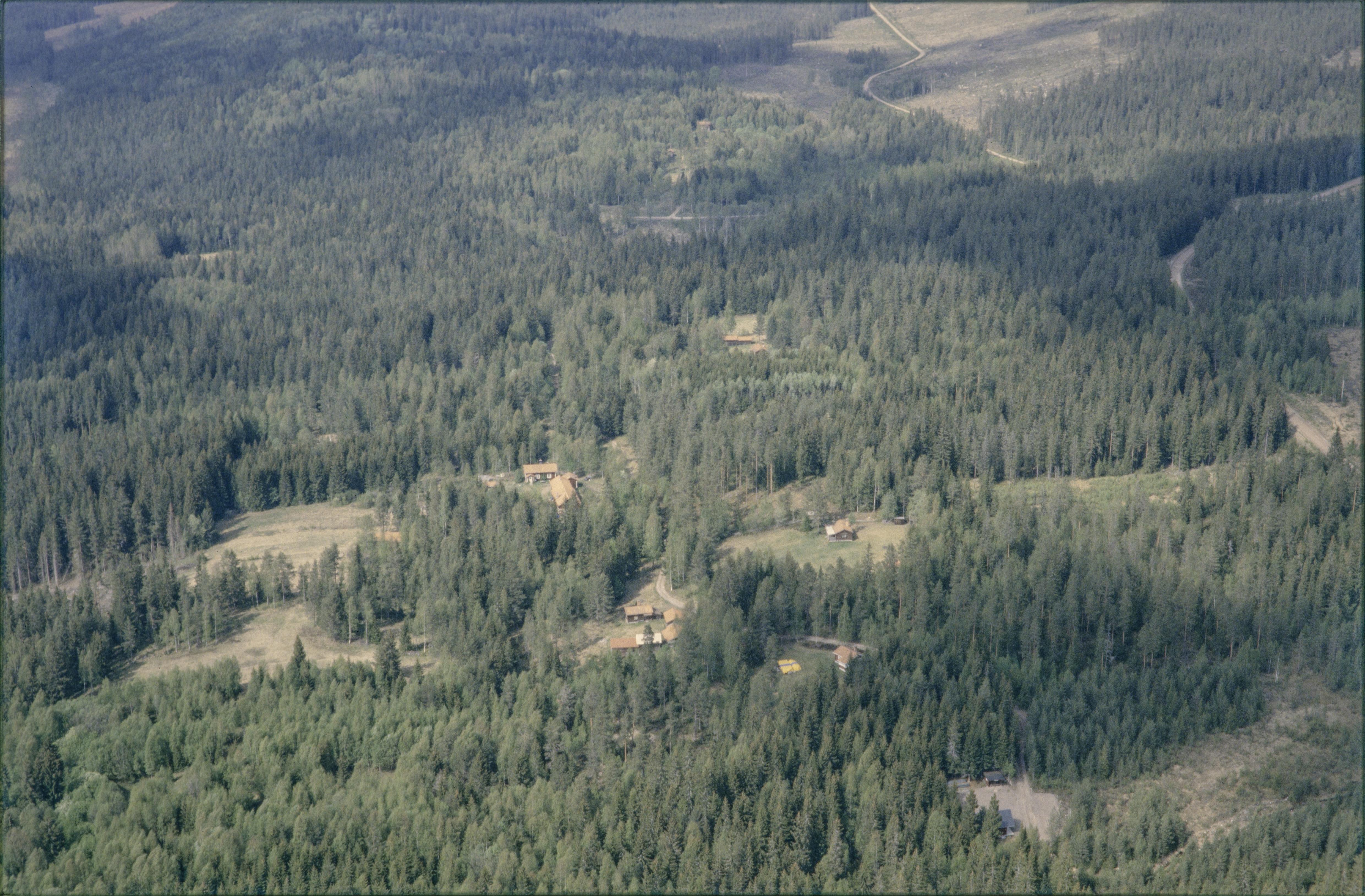 Beskrivning: Björntjärnsbäckens dalgång. Dammskogs fäbodmiljö RAÄnr Leksand 682:1-4 i bildens nedre del. Över bildens mitt byn Skallskog. Bilden är tagen mot (väderstreck): N