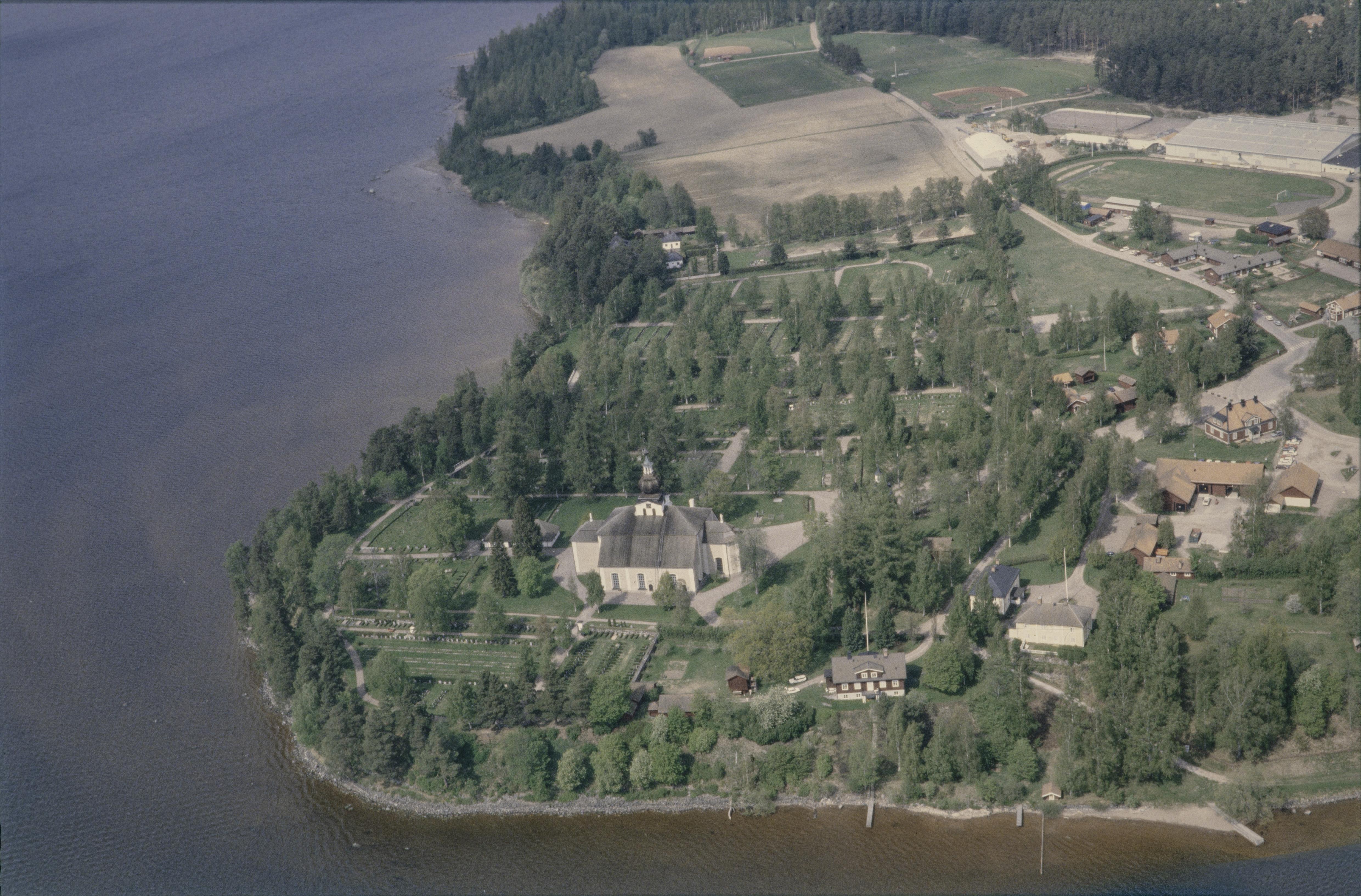 Beskrivning: Leksands tätort i området där Österdalsälven (i bildens nedre kant) och Österviken i sjön Siljan möts. Leksands kyrka med gravplats RAÄnr Leksand 905:3 nere till vänster. Över bildens mitt byggnadsminnet Hildasholm. Bilden är tagen mot (väderstreck): N