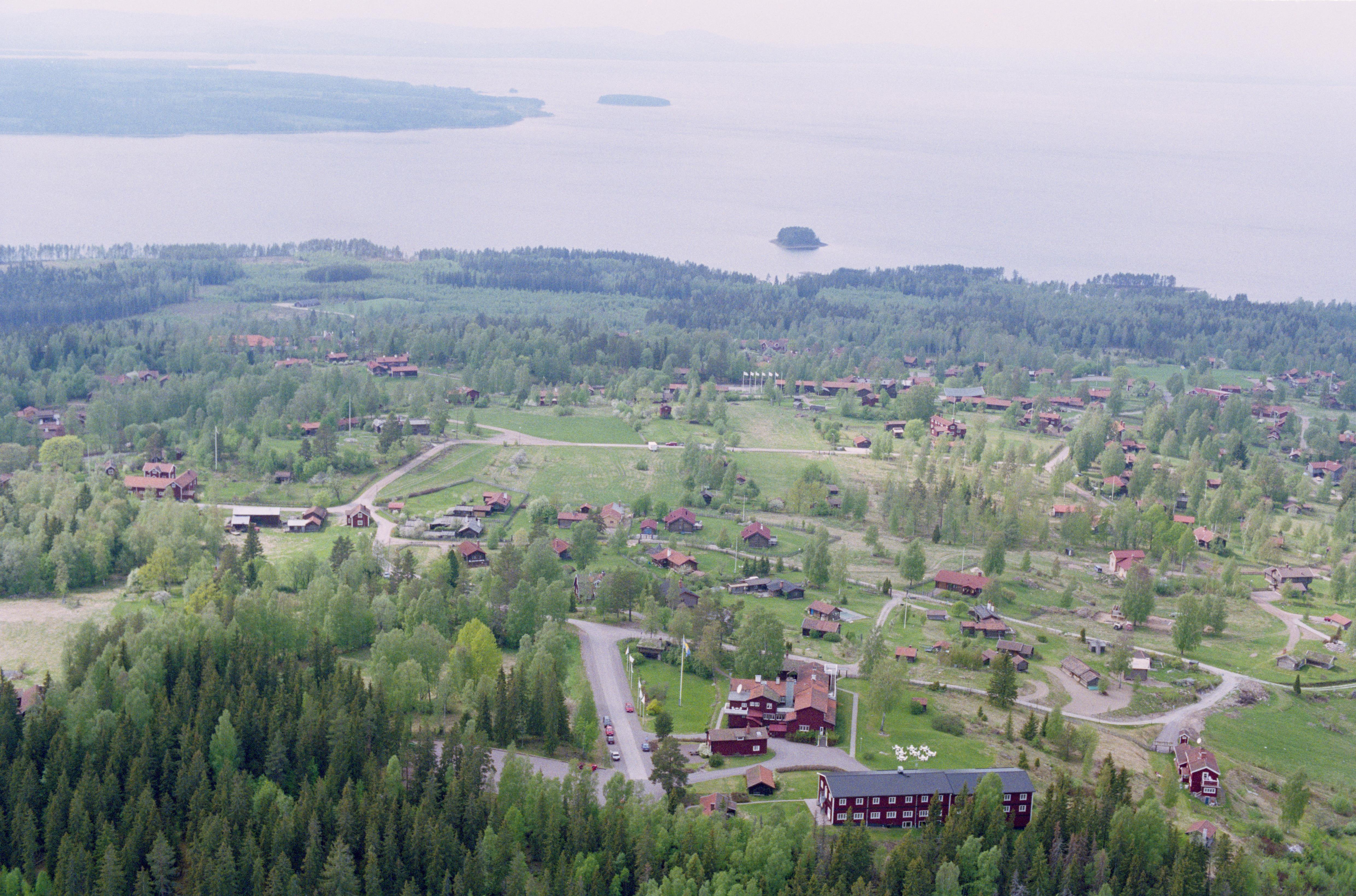 Beskrivning: Tällbergs tätort. Långbersgården i bildens nedre del. I bildens övre del sjön Siljan. Bilden är tagen mot (väderstreck): VNV
