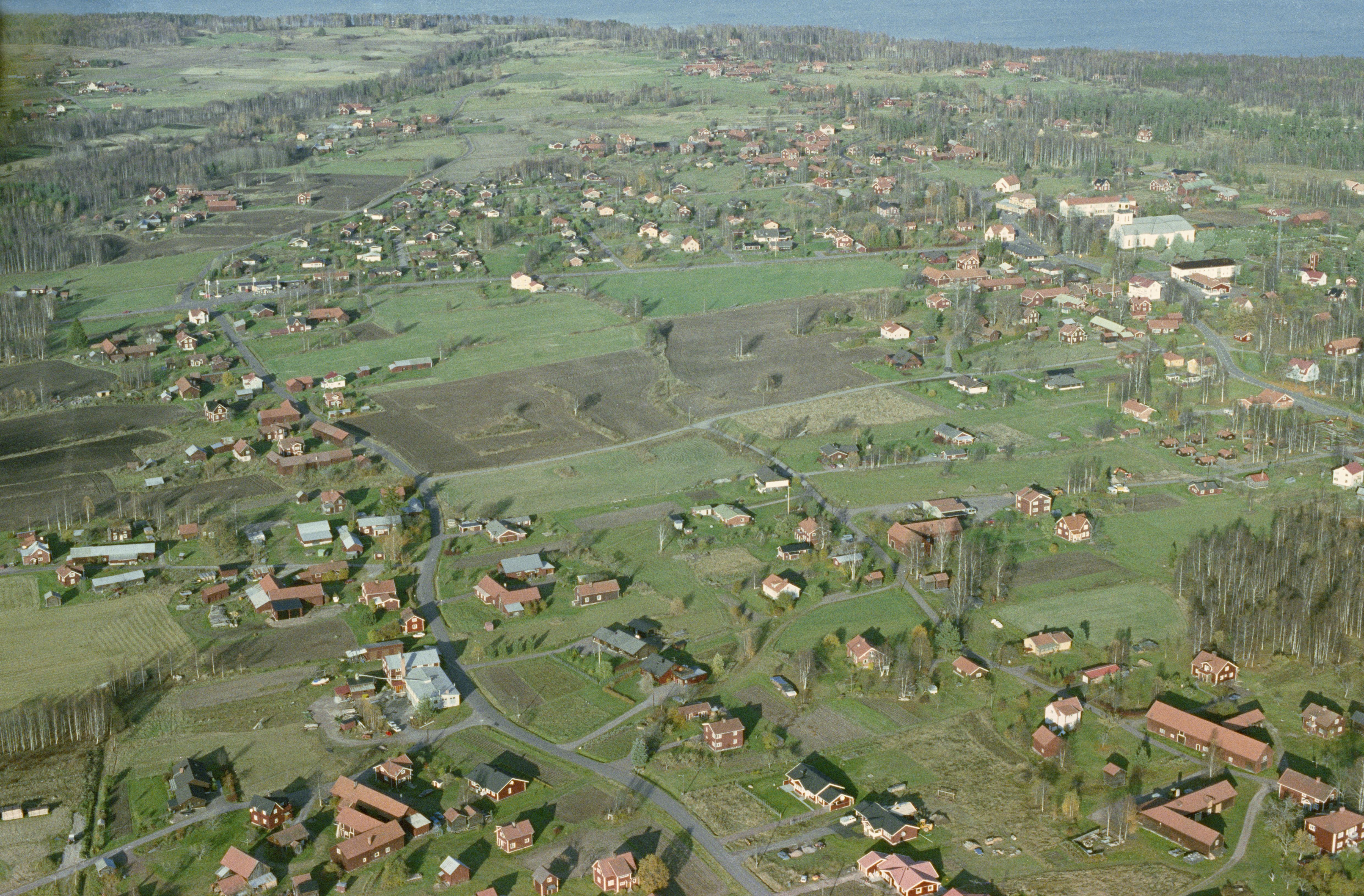 Beskrivning: Sollerö tätort på ön Sollerön i sjön Siljan. Solleröns kyrka uppe till höger. I bildens övre kant område med blästbrukslämningar RAÄnr Sollerön 112:1. Bilden är tagen mot (väderstreck): NNO