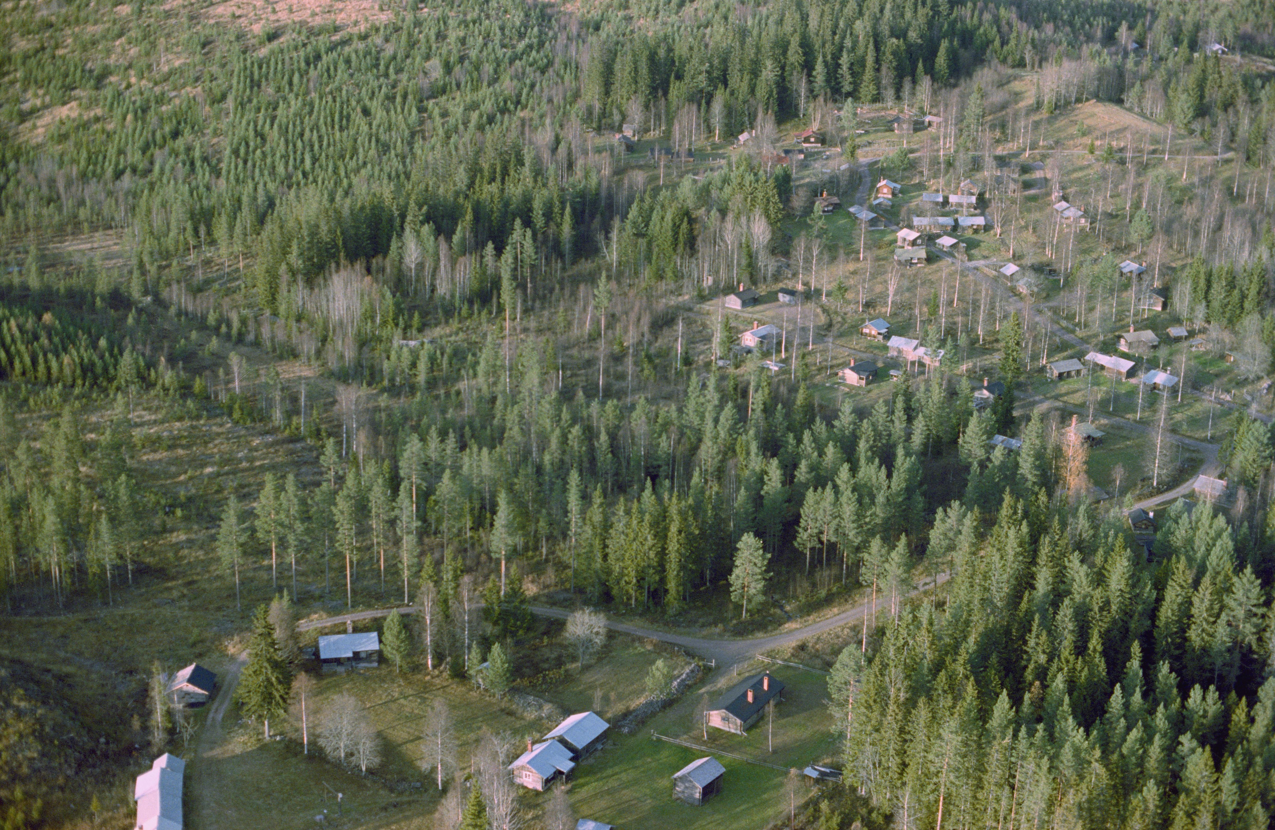 Beskrivning: Fäbodsbyn Övre Bjönsaberg (skrivs även Bönsaberg). Nere till vänster fäbodar med nummer 797, 709 ,713, 714 m.fl. I bildens övre del bildens mitt ett härbre med ristningar RAÄnr Våmhus 16:2. Bilden är tagen mot (väderstreck): NNV