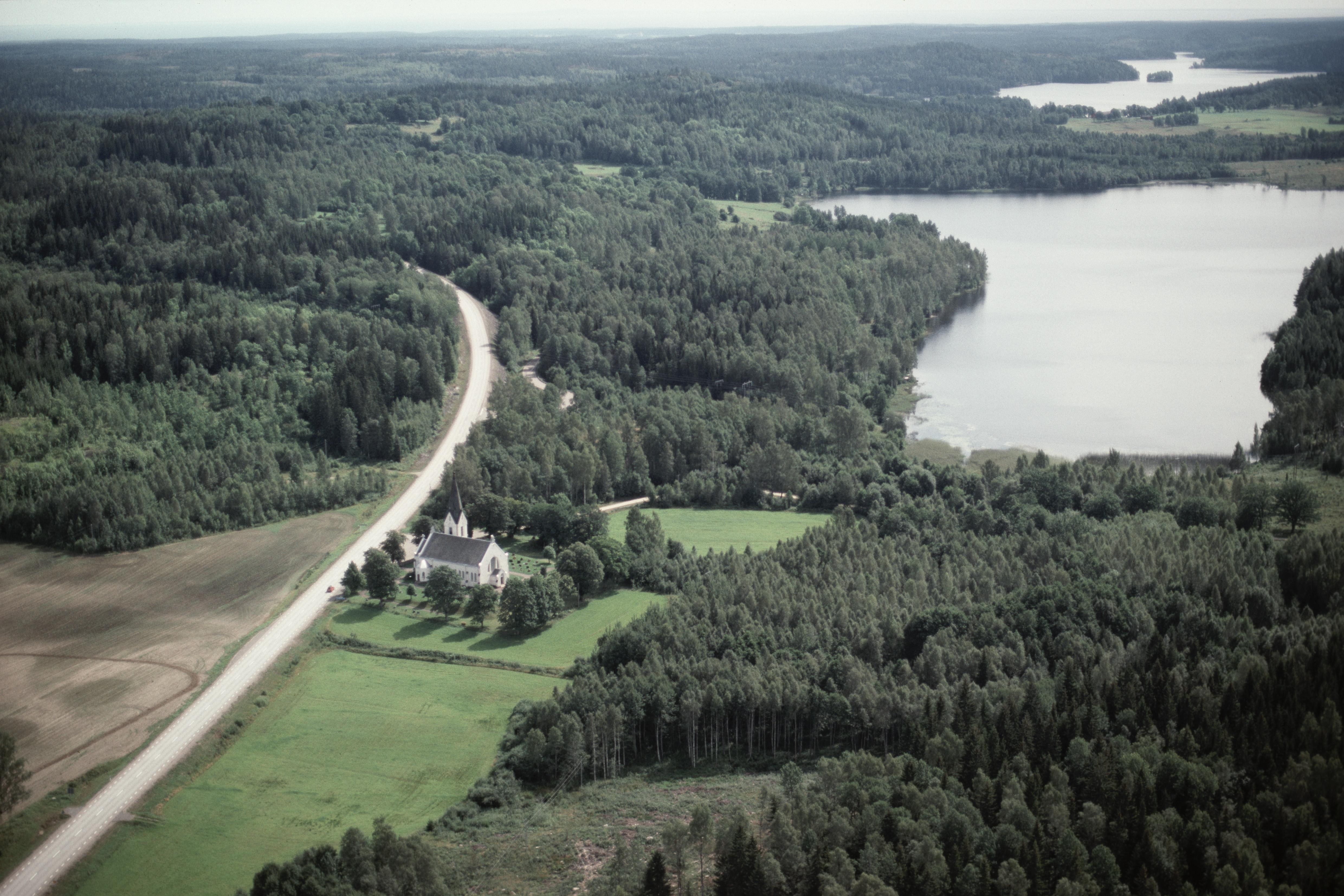 Beskrivning: Edsleskogs kyrka vid sjön Bräcketjärnet. I området nere till vänster kyrkoruin RAÄnr Edsleskog 49:1. Bilden är tagen mot (väderstreck): SSO
