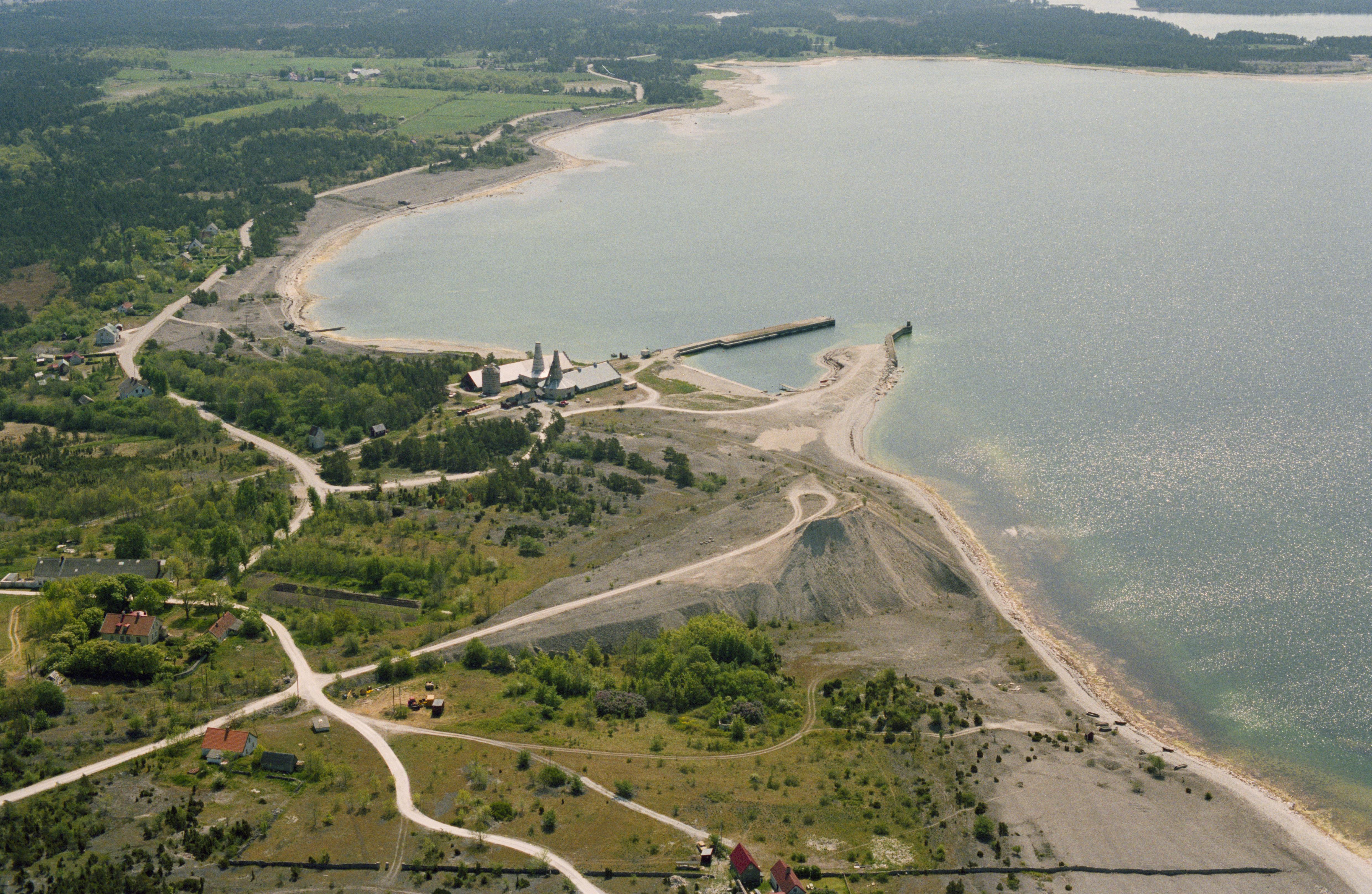 Beskrivning: Vid bildens mitt kalkugnar vid hamnen i Bläse fiskeläge och industriort vid Kappelshamnsviken. I området lämningar efter kalstensindustri; arbetarbostäder, järnväg, hamn RAÄnr Fleringe 94:6, stenbrott, kalkugnar, m.fl. Bilden är tagen mot (väderstreck): S
