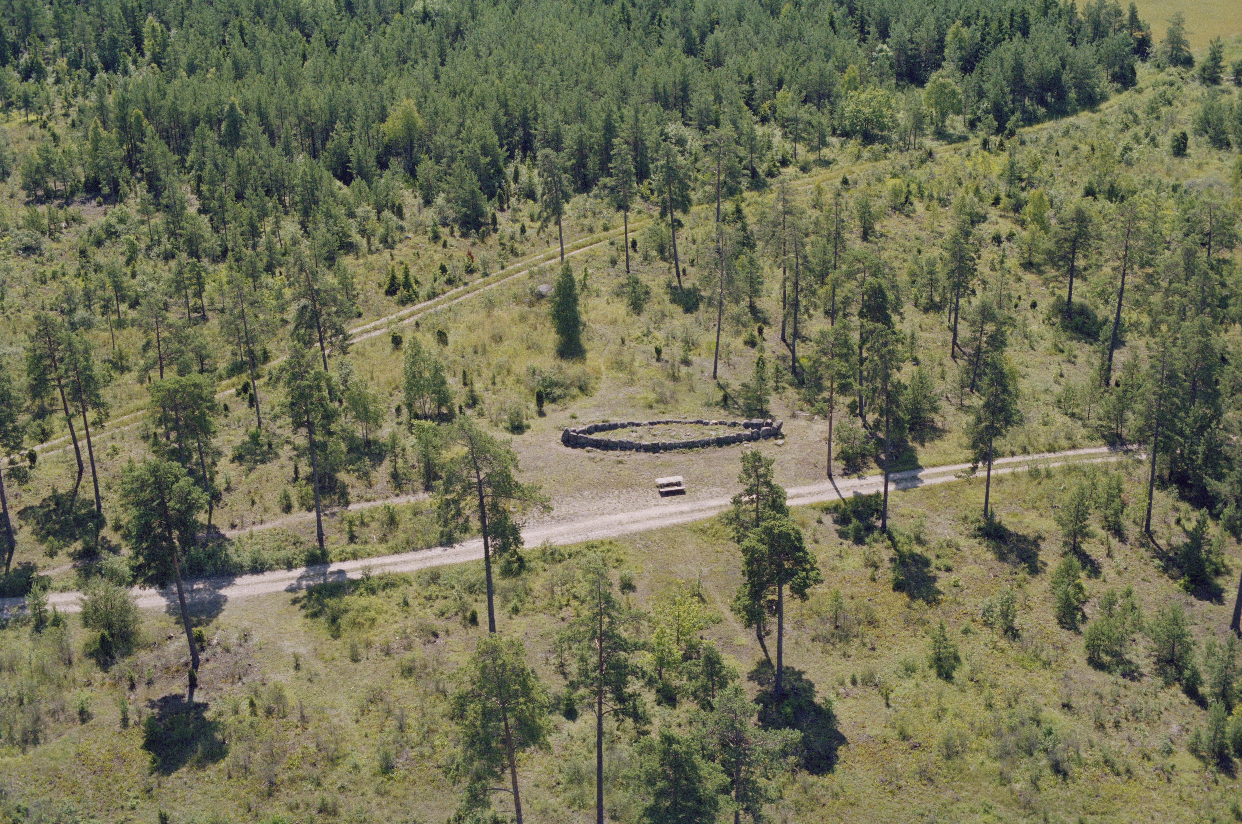Beskrivning: Skeppssättningen Tjelvars grav RAÄnr Boge 28:1 i skogen vid Millhagen i Gothems socken, norr om gränsen mot Boge socken. Bilden är tagen mot (väderstreck): S